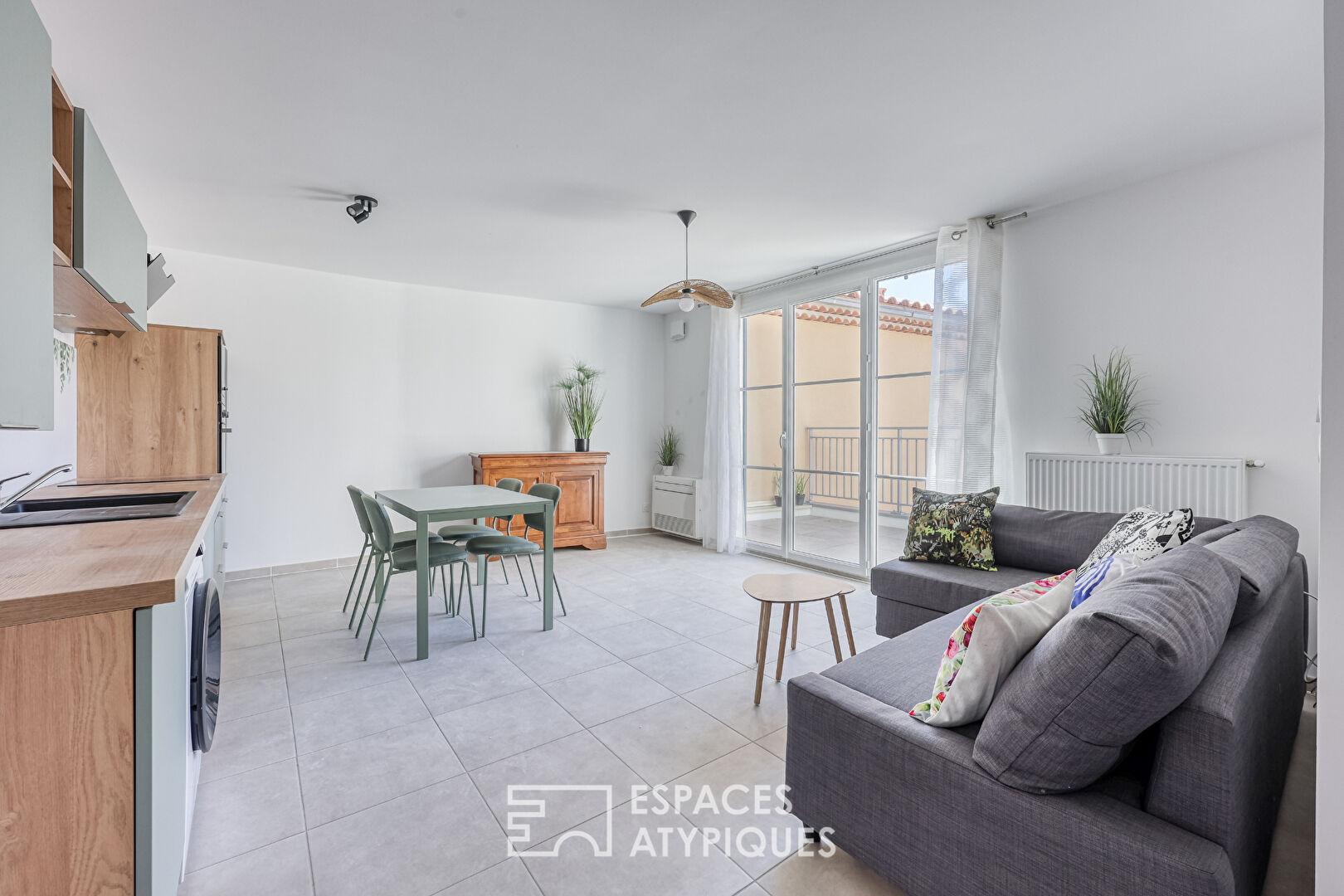 La pièce de vie, aux volumes fluides, intègre une cuisine équipée haut de gamme et s’ouvre largement sur une terrasse de 10 m² exposée plein sud, prolongeant l’espace vers l’extérieur.
