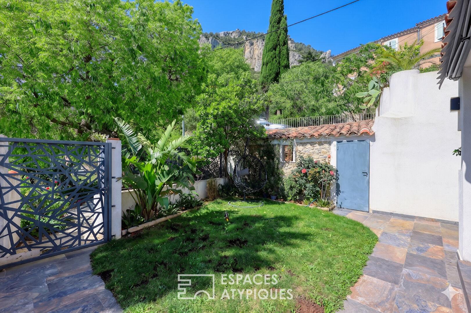 À l’extérieur, un jardin ombragé, à l’abri des regards, invite à la détente. Un petit cabanon en pierre vient compléter ce tableau, offrant un espace de rangement pratique et authentique.