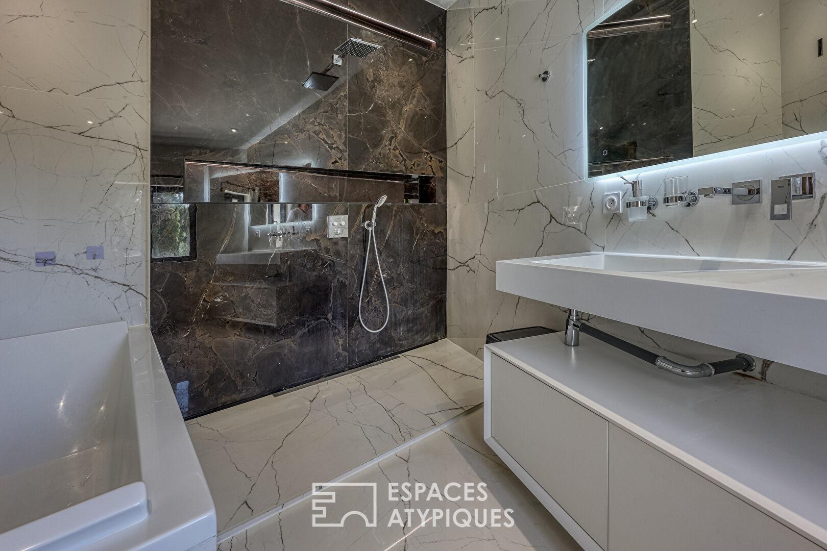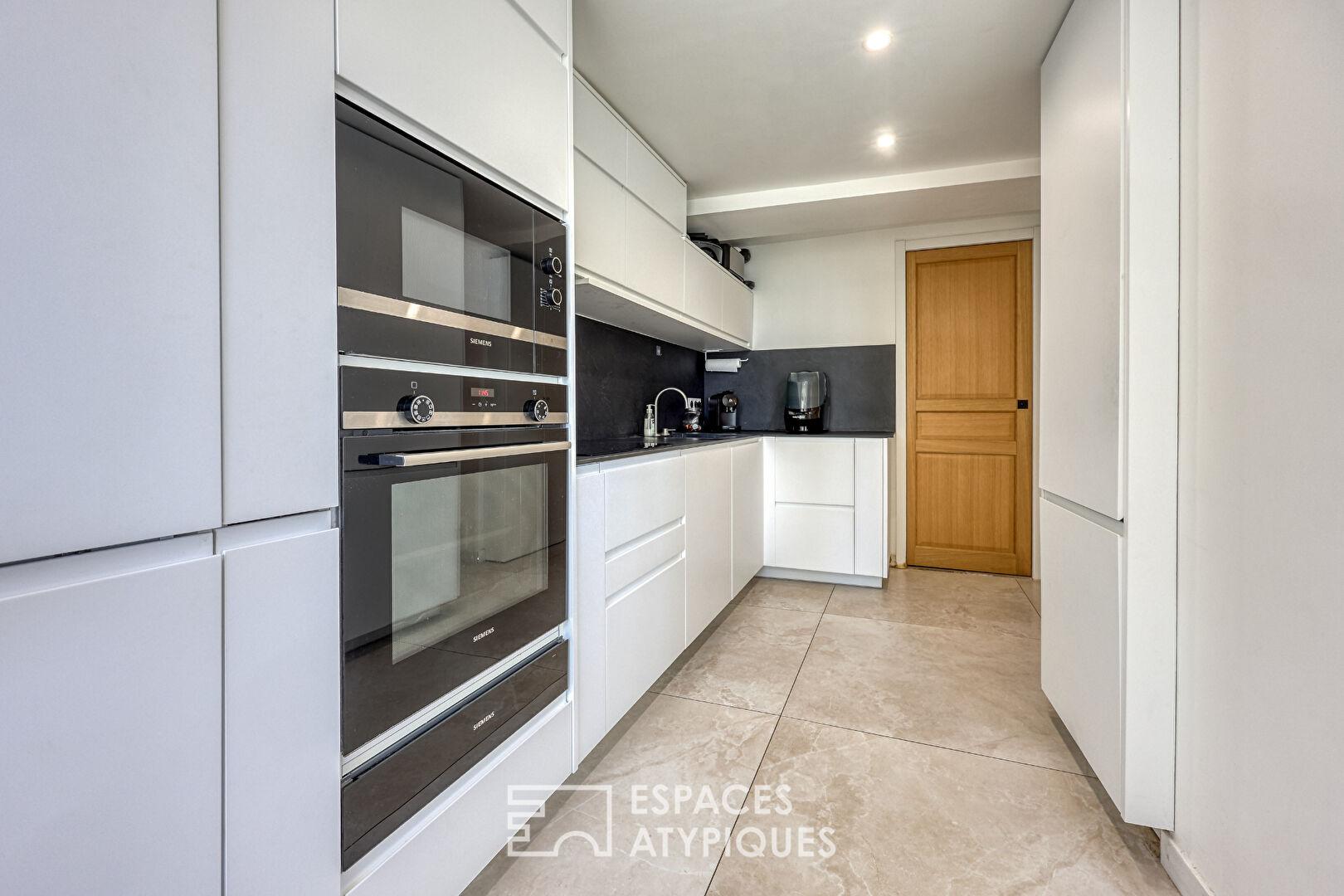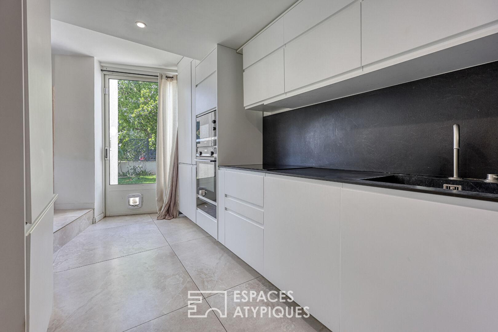 L’entrée s’ouvre sur une pièce de vie harmonieuse. Elle accueille un salon cosy et une salle à manger rythmée par un magnifique escalier contemporain. La cuisine semi-ouverte, aux lignes minimalistes et entièrement équipée, se fond parfaitement dans le décor. Cet espace, habillé de larges dalles de grès cérame, offre un accès direct à un extérieur intimiste.