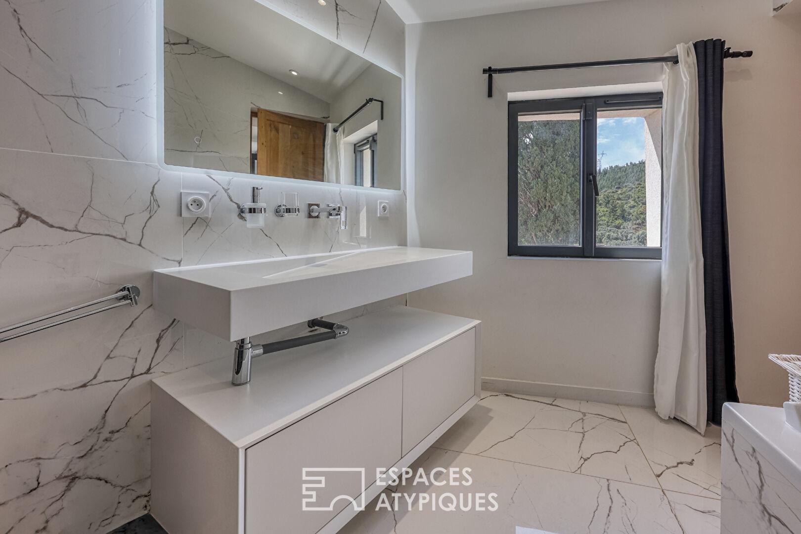 Le point d’orgue de ce niveau est sans nul doute l’accès à une vaste terrasse suspendue. Véritable pièce de vie à ciel ouvert, elle offre une vue panoramique époustouflante sur les collines environnantes et la mer à l’horizon.