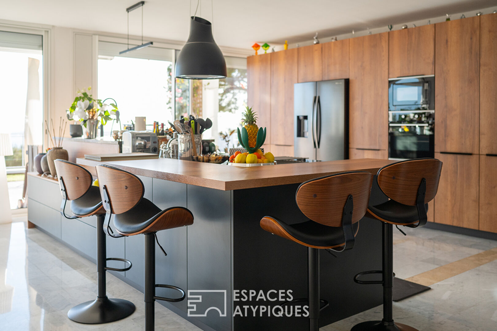 Dès l’entrée, un très grand espace de vie se dévoile, accueillant une cuisine haut de gamme ouverte sur la salle à manger et la terrasse Sud de plus de 100 m2. En arrière plan, le salon offre également un autre angle de vue tout aussi impressionnant. La vue mer est omniprésente depuis l’intérieur.
