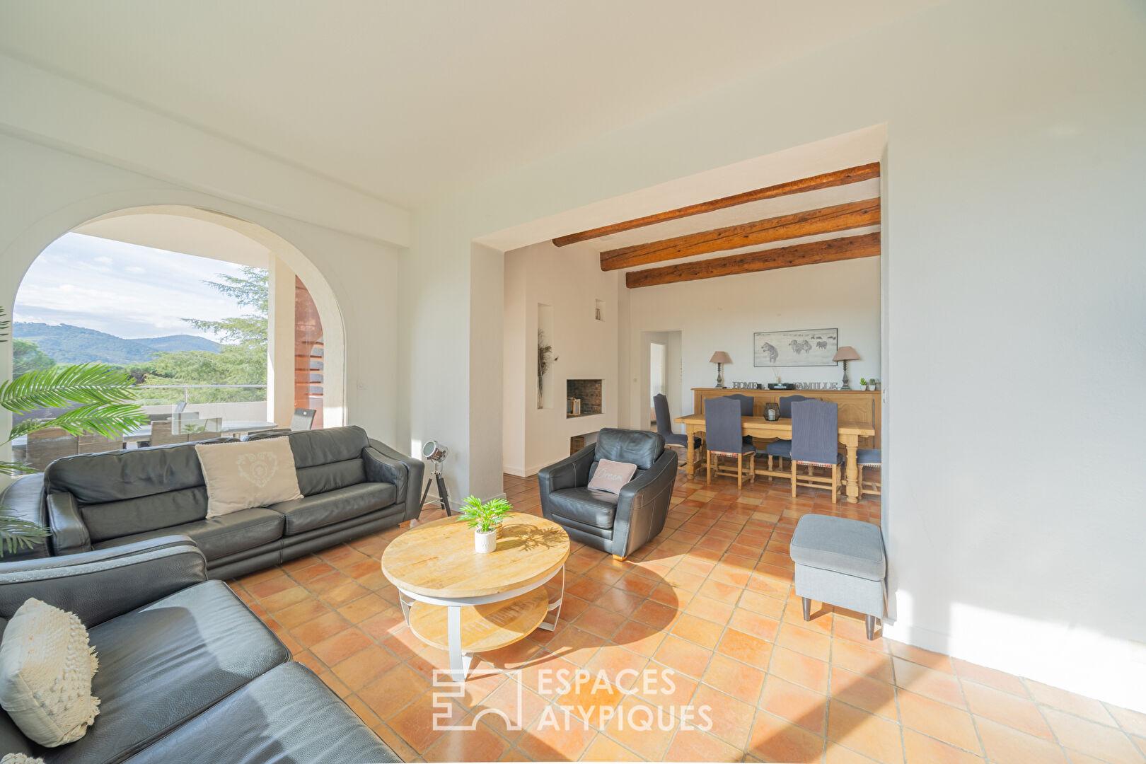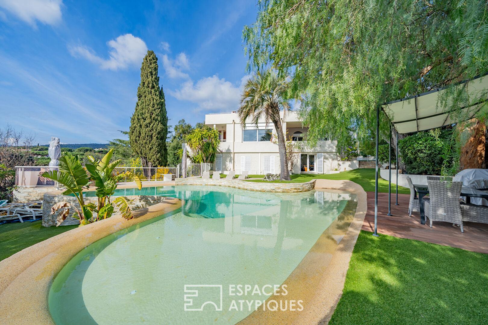 À l’extérieur, le jardin arboré constitue un véritable havre de paix en zone urbaine. Les terrasses prolongent naturellement les pièces de vie, offrant des espaces de détente ombragés pour profiter du climat méditerranéen.
