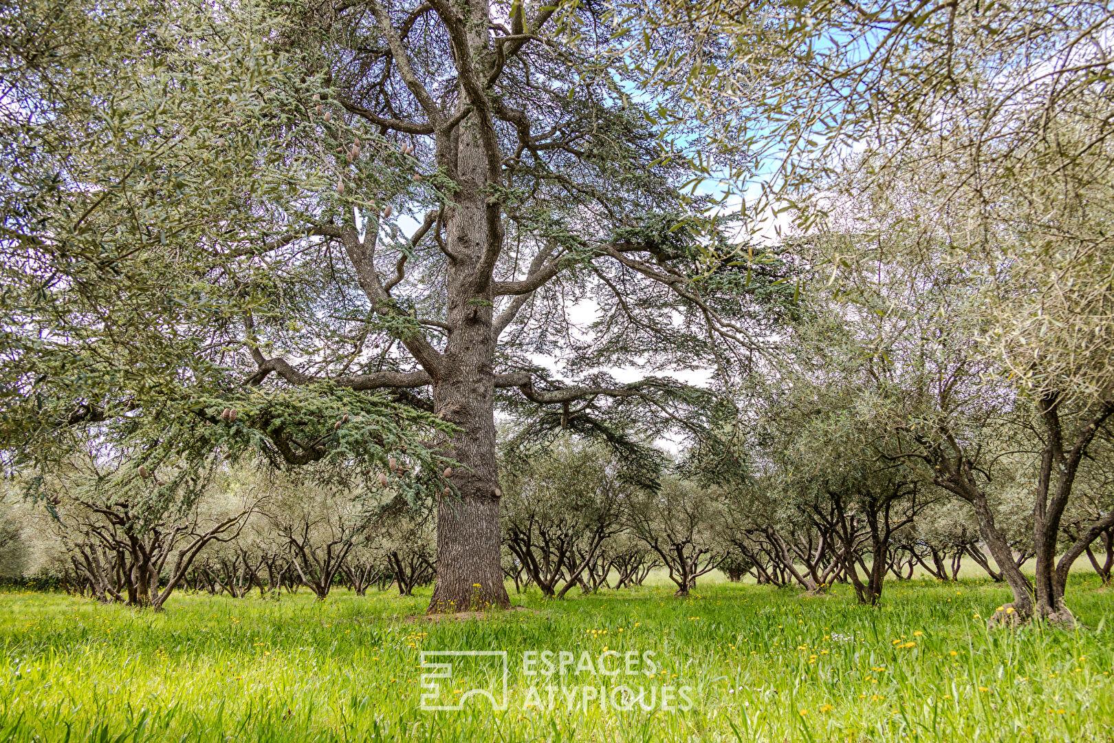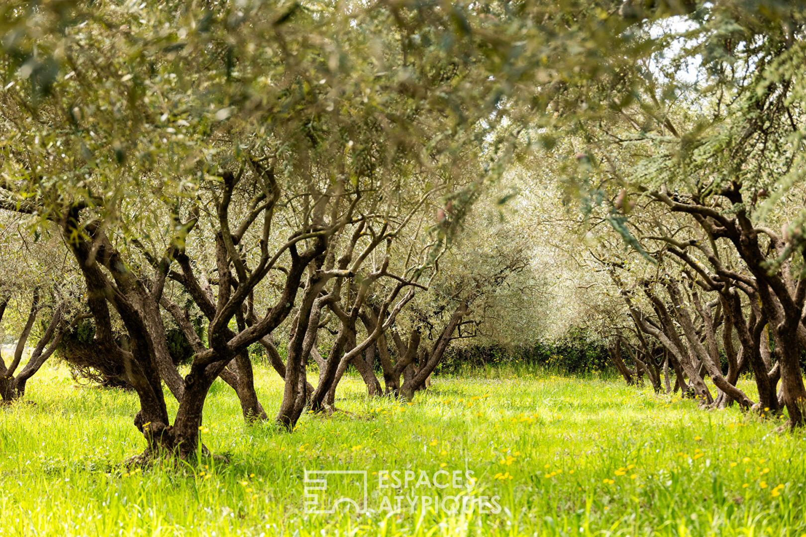 Une centaine d’oliviers composent l’oliveraie qui s’étend au sud du terrain, des champs de luzerne et une petite forêt complètent le parc. L’environnement est calme, discret, préservé et entouré de vignes.