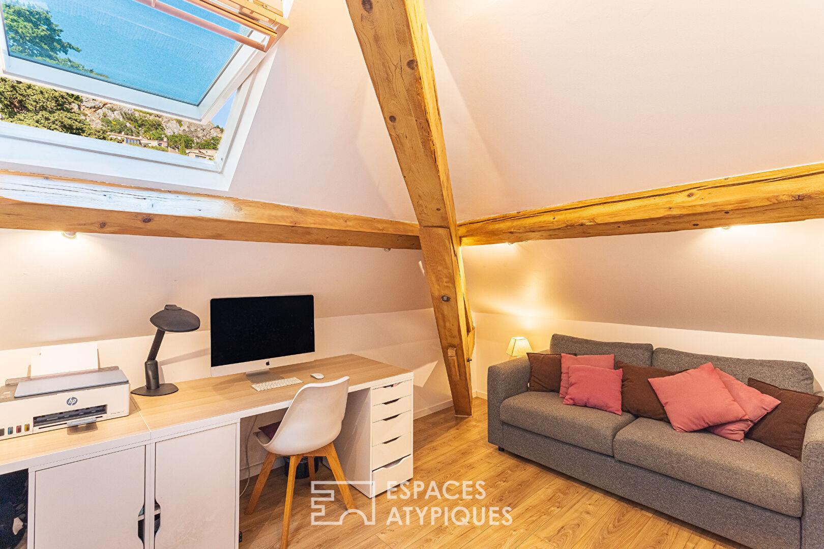 Deux autres chambres, nichées sous la charpente et éclairées par des velux orientés vers la colline, offrent des espaces cocooning à proximité d’une salle d’eau aux poutres apparentes.