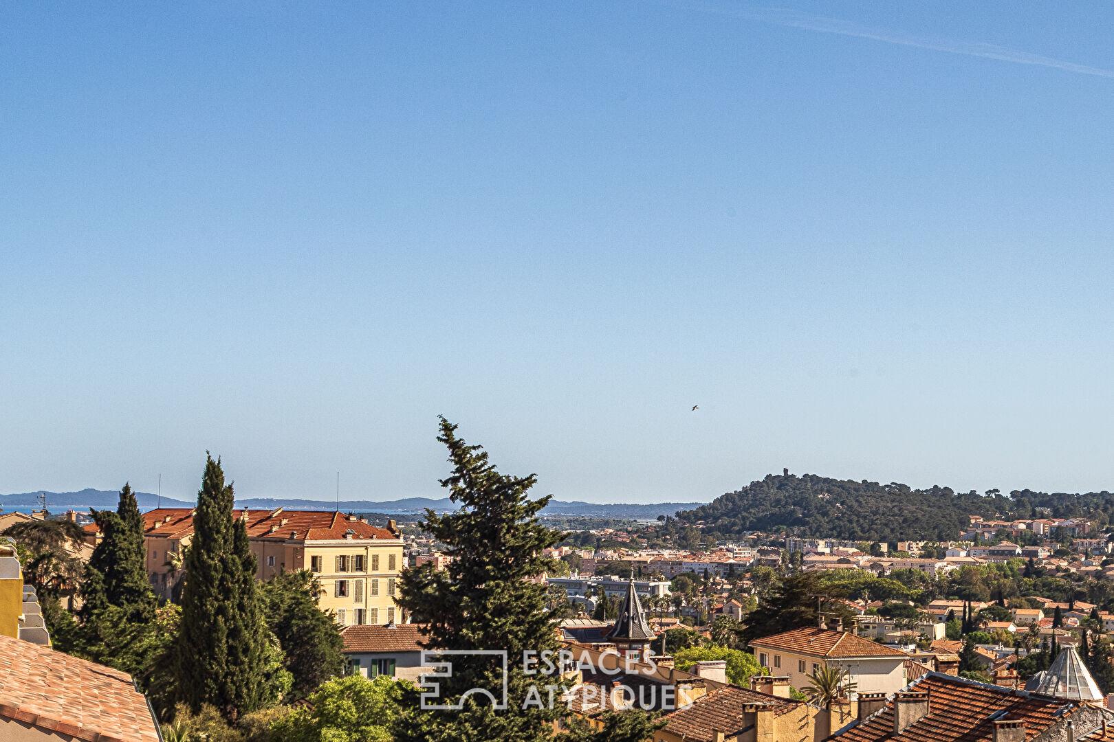 Dans une rue emblématique de la Belle Époque à Hyères Var, où se succèdent des demeures élégantes, ce petit immeuble de caractère abrite un appartement sous les toits au charme singulier.