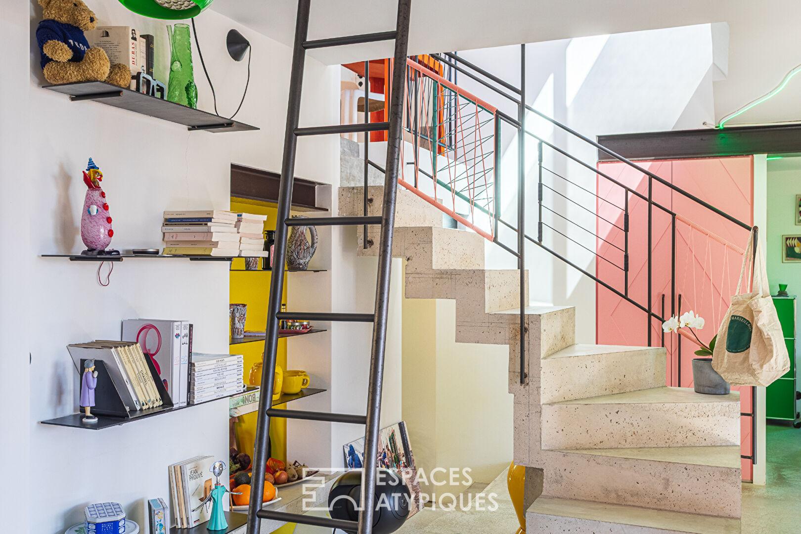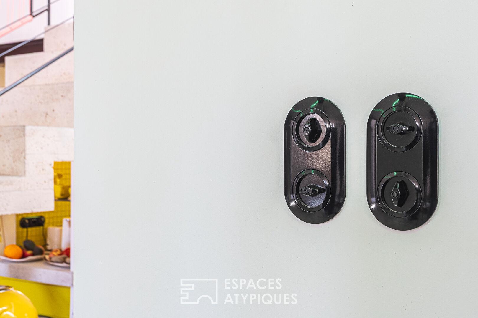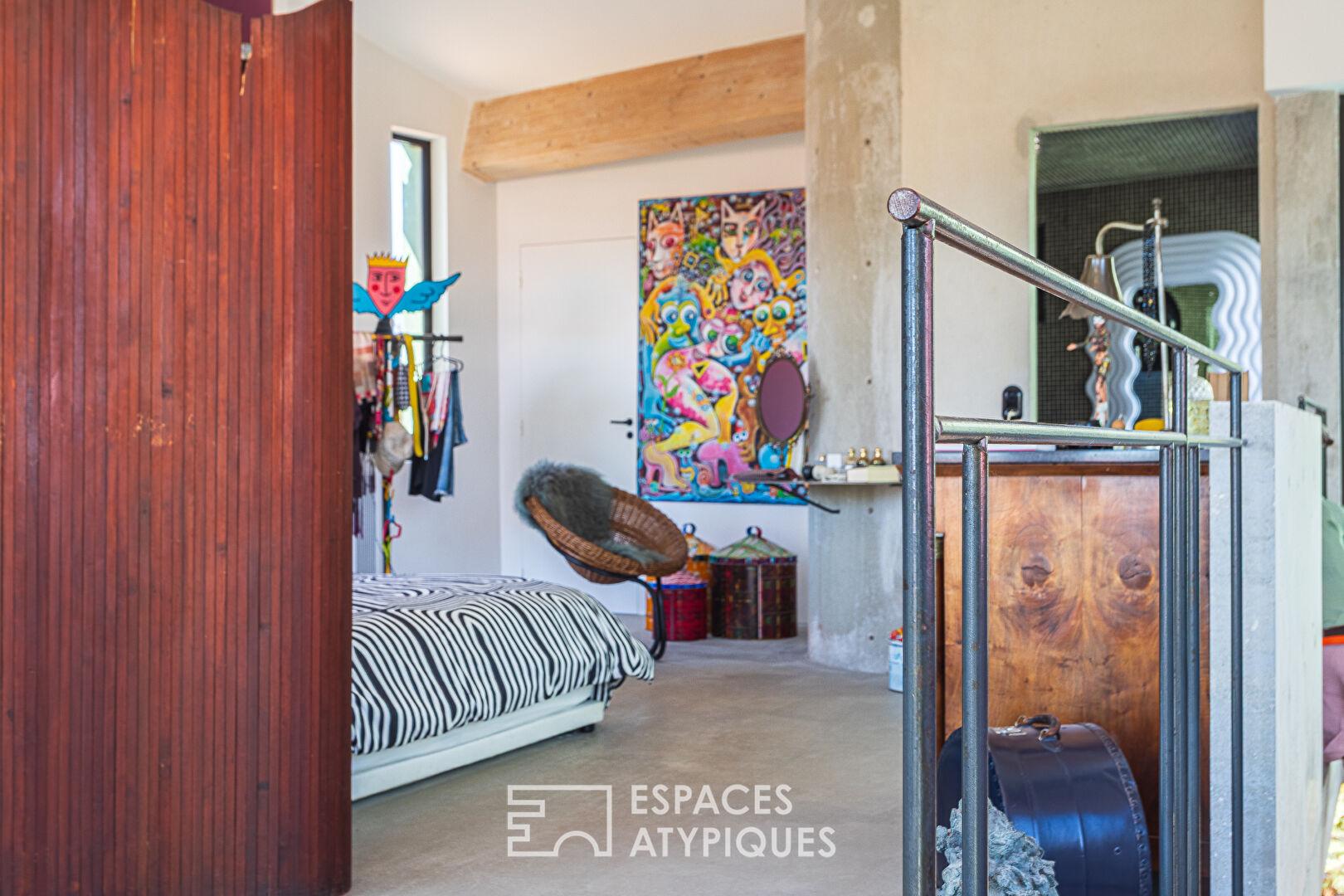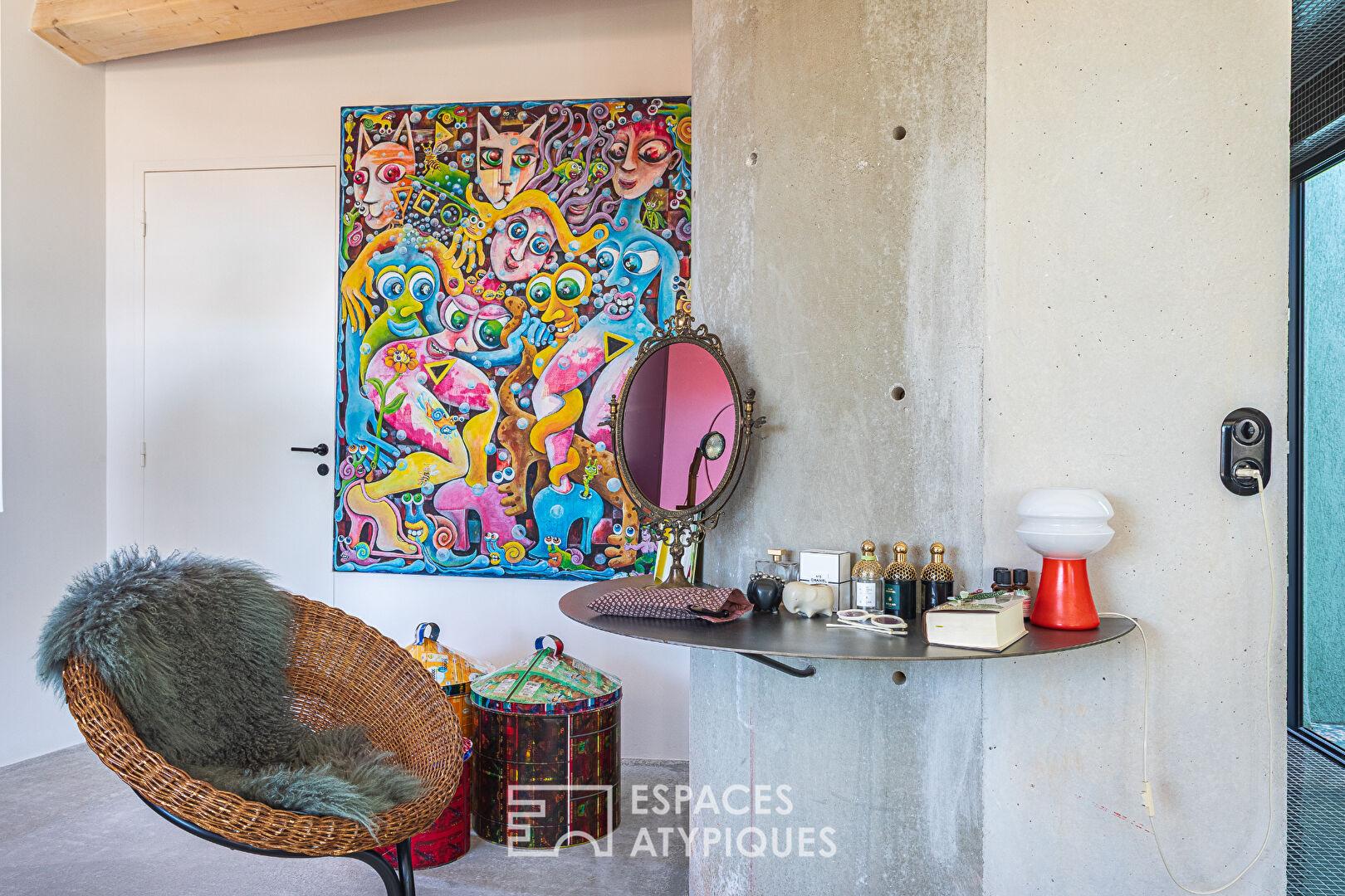 La pièce de vie, baignée de lumière, s’articule autour d’éléments design et d’un escalier en béton brute, véritable pièce maîtresse qui structure l’espace avec élégance et originalité. Les matériaux et les finitions participent à l’atmosphère contemporaine et chaleureuse du lieu.