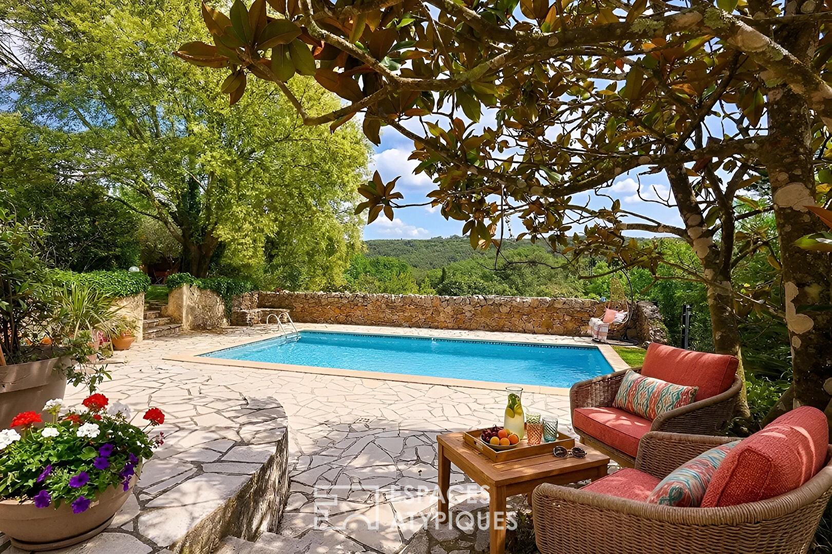 À l’extérieur, le jardin se vit comme une extension naturelle des espaces de réception. Organisé autour d’une piscine de 8,5 x 4,5 m, il invite à la détente et aux moments partagés. Une cuisine d’été avec four à pain authentique prolonge l’art de vivre en toute saison. Un garage et une remarquable cave voûtée d’environ 80 m², à réinventer selon les envies, complètent ce bien.