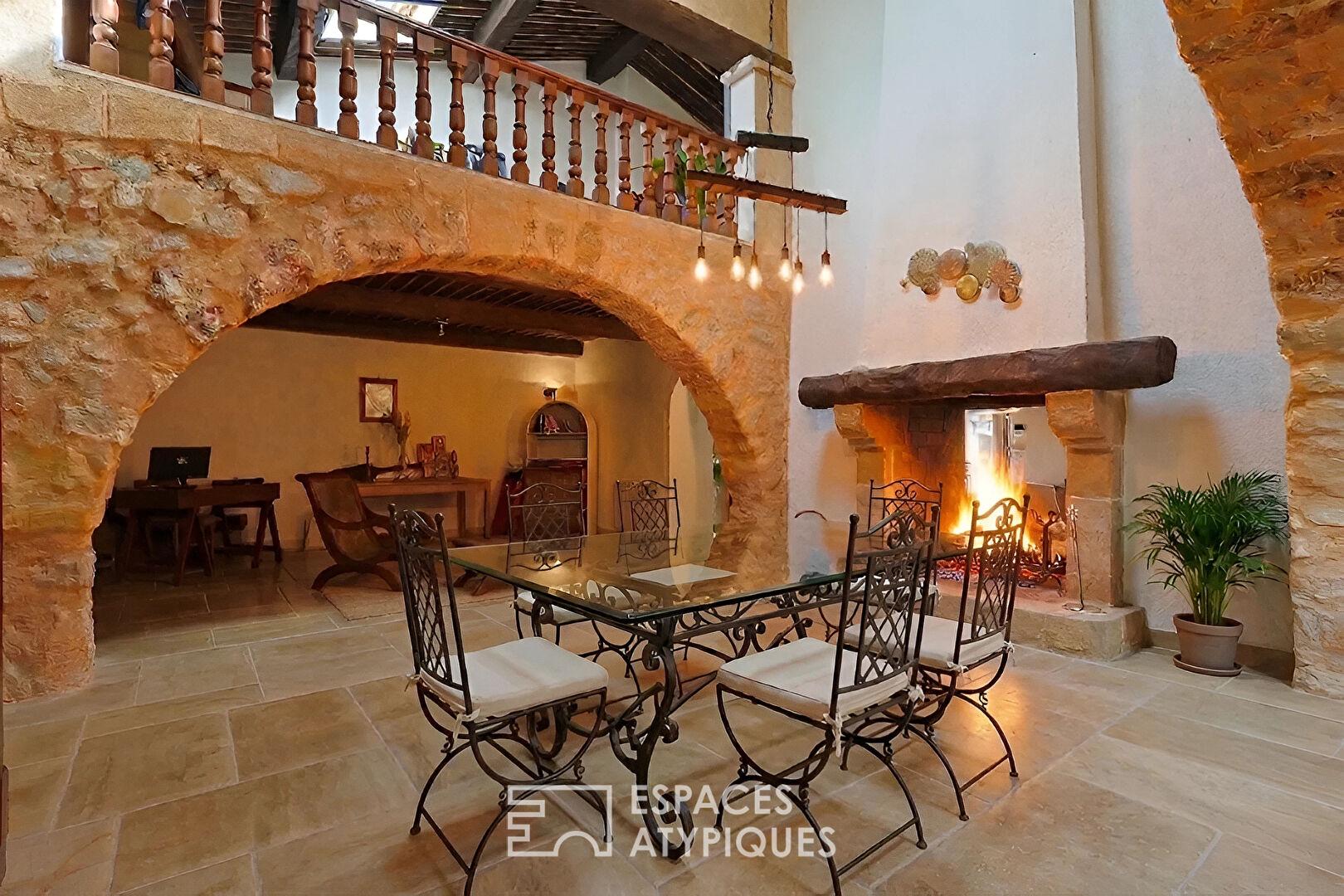 Dès l’entrée, le regard est happé par une spectaculaire pièce de vie de plus de 120 m², véritable coeur battant de la maison. Les volumes hors normes dialoguent avec une atmosphère chargée d’histoire : hauteurs sous plafond vertigineuses oscillant entre 4 et 6 mètres, plafonds à la française, voûtes en pierre et sol en pierre de Bourgogne composent un décor à la fois brut et raffiné. Une cheminée traversante structure les espaces et relie avec élégance le salon à la salle à manger, tandis qu’un espace bureau s’inscrit en retrait. Les puits de lumière viennent souligner la verticalité et magnifier la clarté naturelle. Le rez-de-chaussée offre également une cuisine indépendante aménagée, une buanderie, un cellier et une salle d’eau.