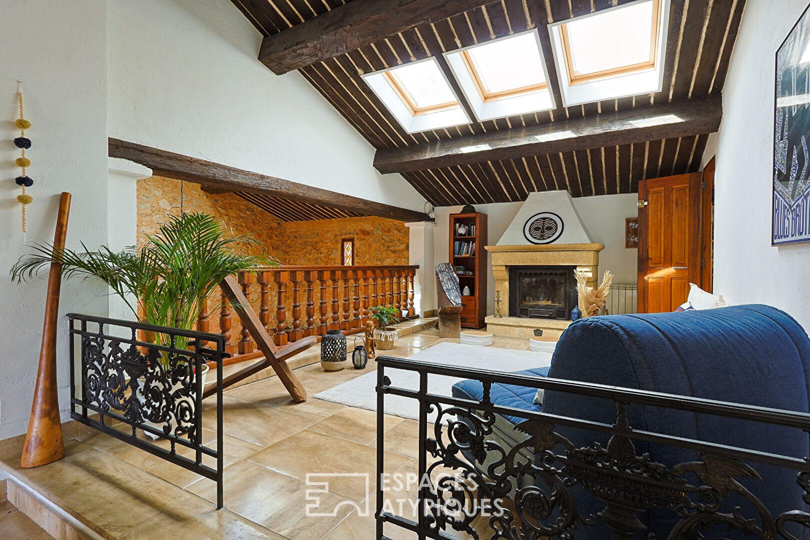L’escalier, sculpté dans la pierre, conduit à l’étage et affirme le caractère architectural du lieu. Une mezzanine ouverte, agrémentée d’une cheminée à insert, surplombe la pièce principale et propose un boudoir intimiste dédié à la détente.