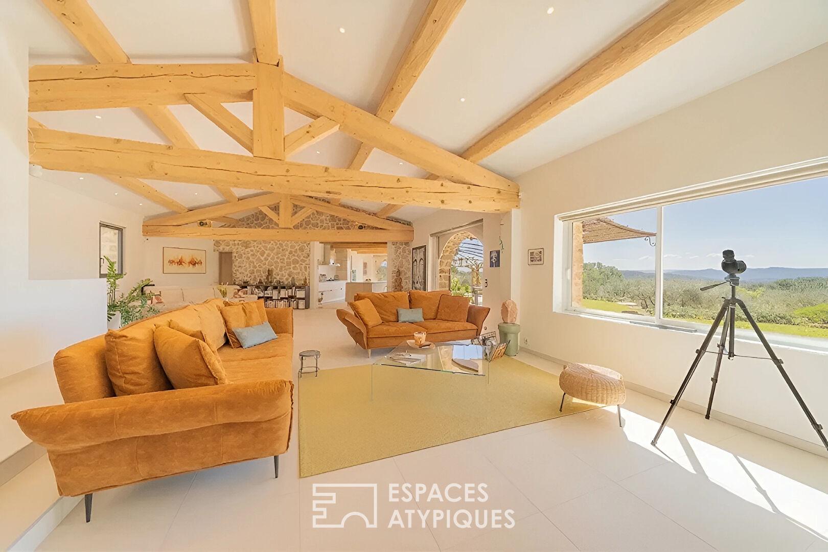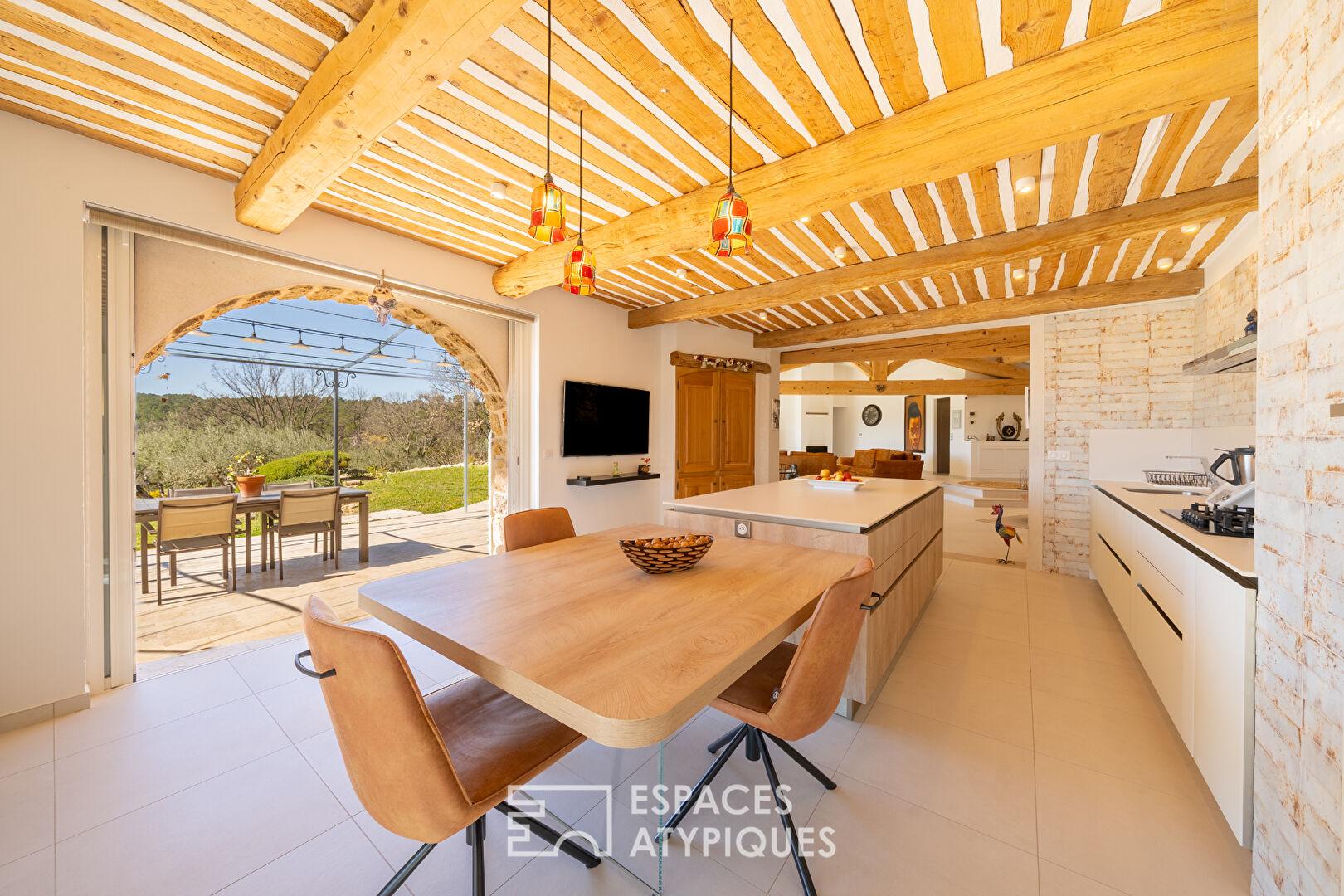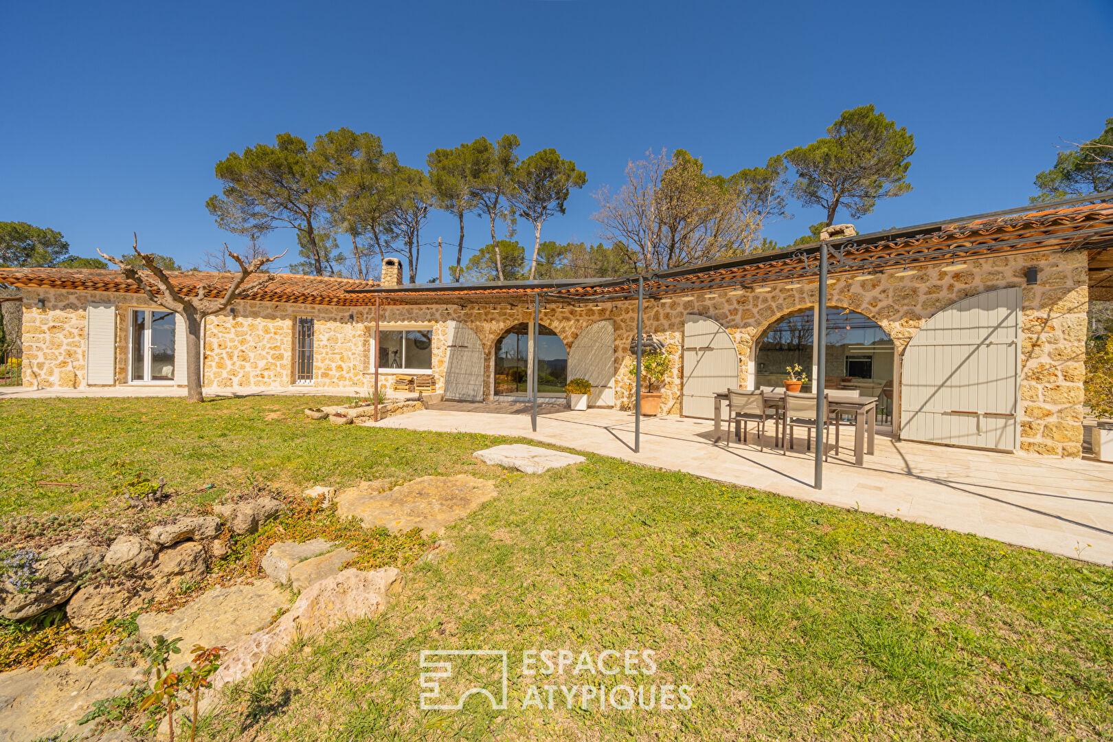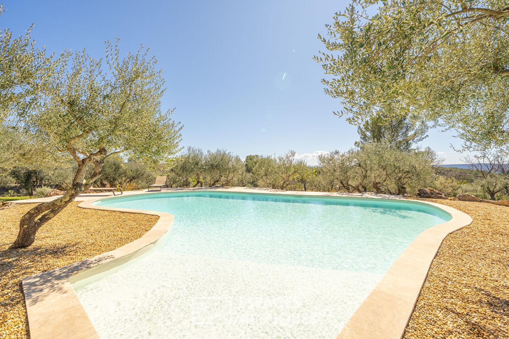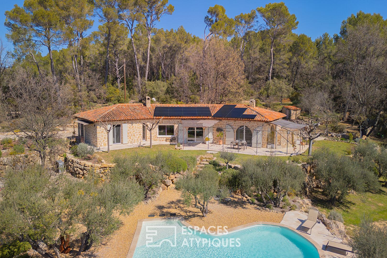 Dominant un paysage préservé de collines et de forêts, cette villa de plain-pied déploie 200 m² de raffinement sur un terrain arboré d’oliviers et de pins d’1.5 hectare. Véritable joyau de l’immobilier de prestige, cette demeure marie avec brio l’authenticité des parements de pierres et le confort d’une rénovation moderne, à quelques minutes d’un village provençal de caractère.