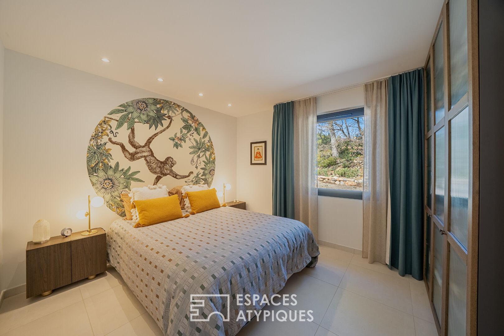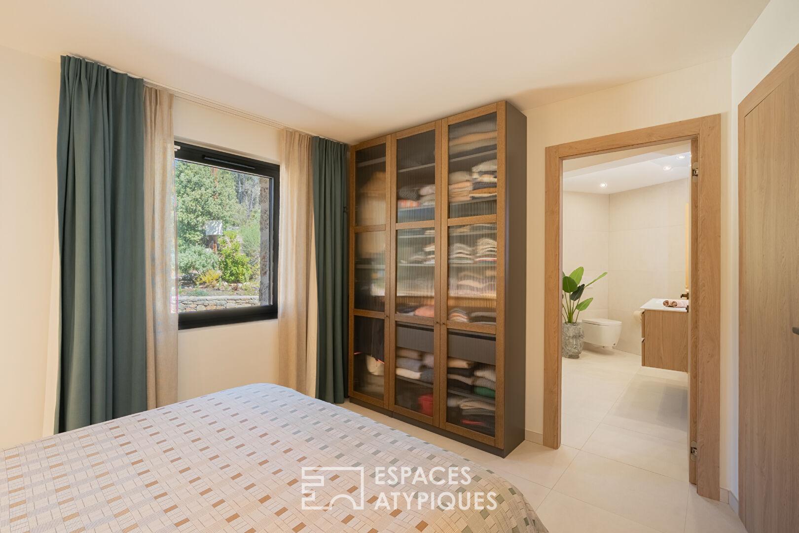 À l’extérieur, le jardin dévoile une piscine aux lignes organiques, parfaitement intégrée à son environnement minéral. Les terrasses offrent un panorama imprenable propice à la contemplation.