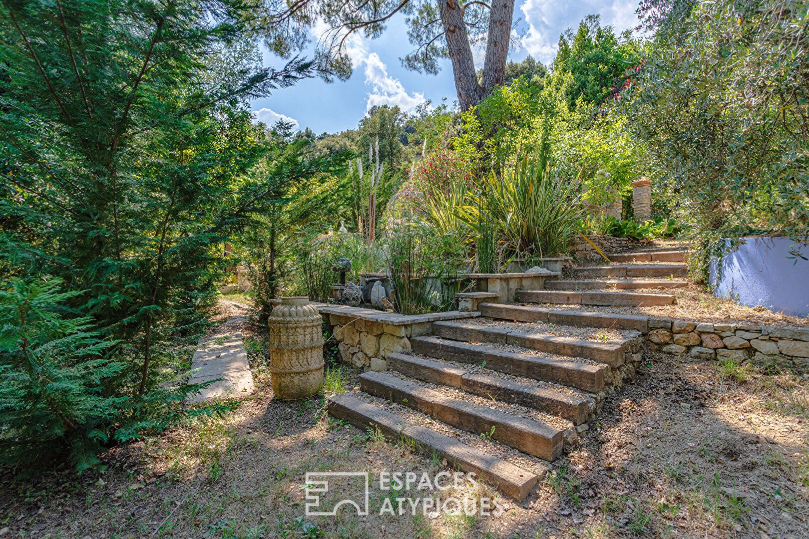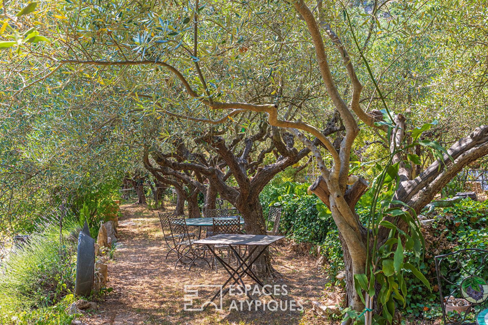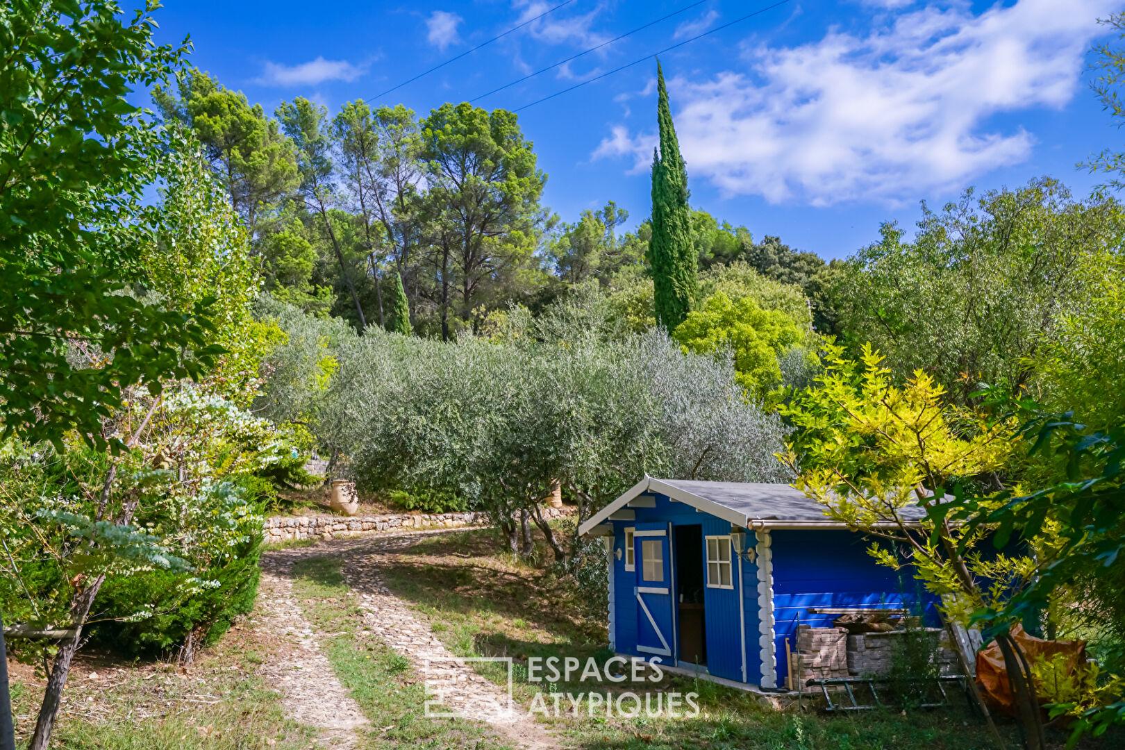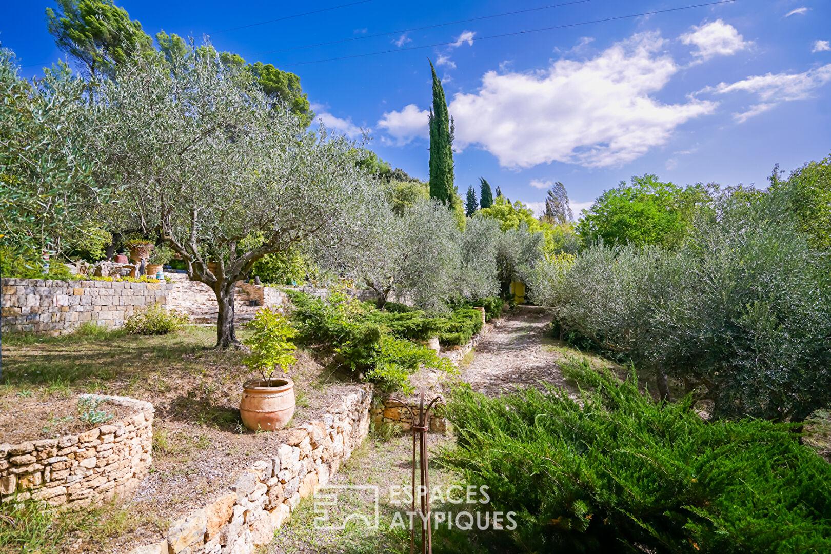 À l’extérieur, le jardin se transforme en un véritable parcours sensoriel, ponctué de ruisseaux alimentés par l’eau de Saint-Martin. Des oliviers permettent la production d’huile d’olive maison, tandis que kakis, cerisiers, abricotiers, mûriers et figuiers complètent ce verger d’exception. Un poulailler, un garage et plusieurs ateliers enrichissent cet espace en parfaite symbiose avec la nature.