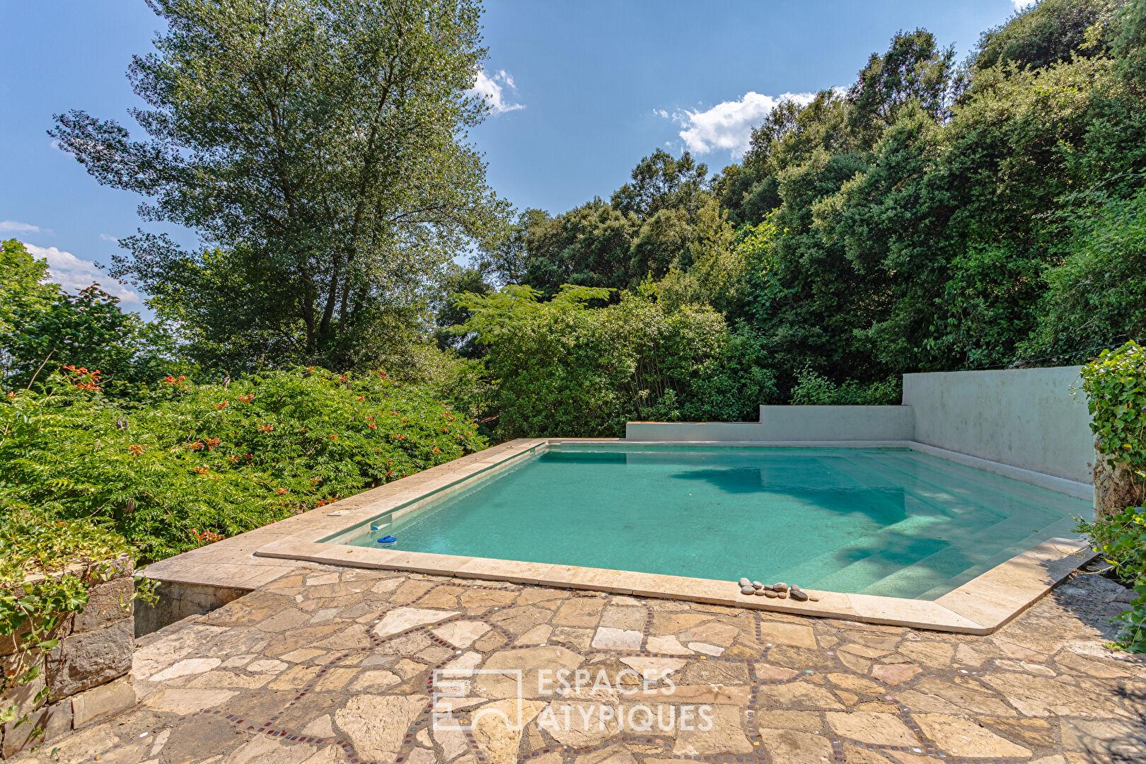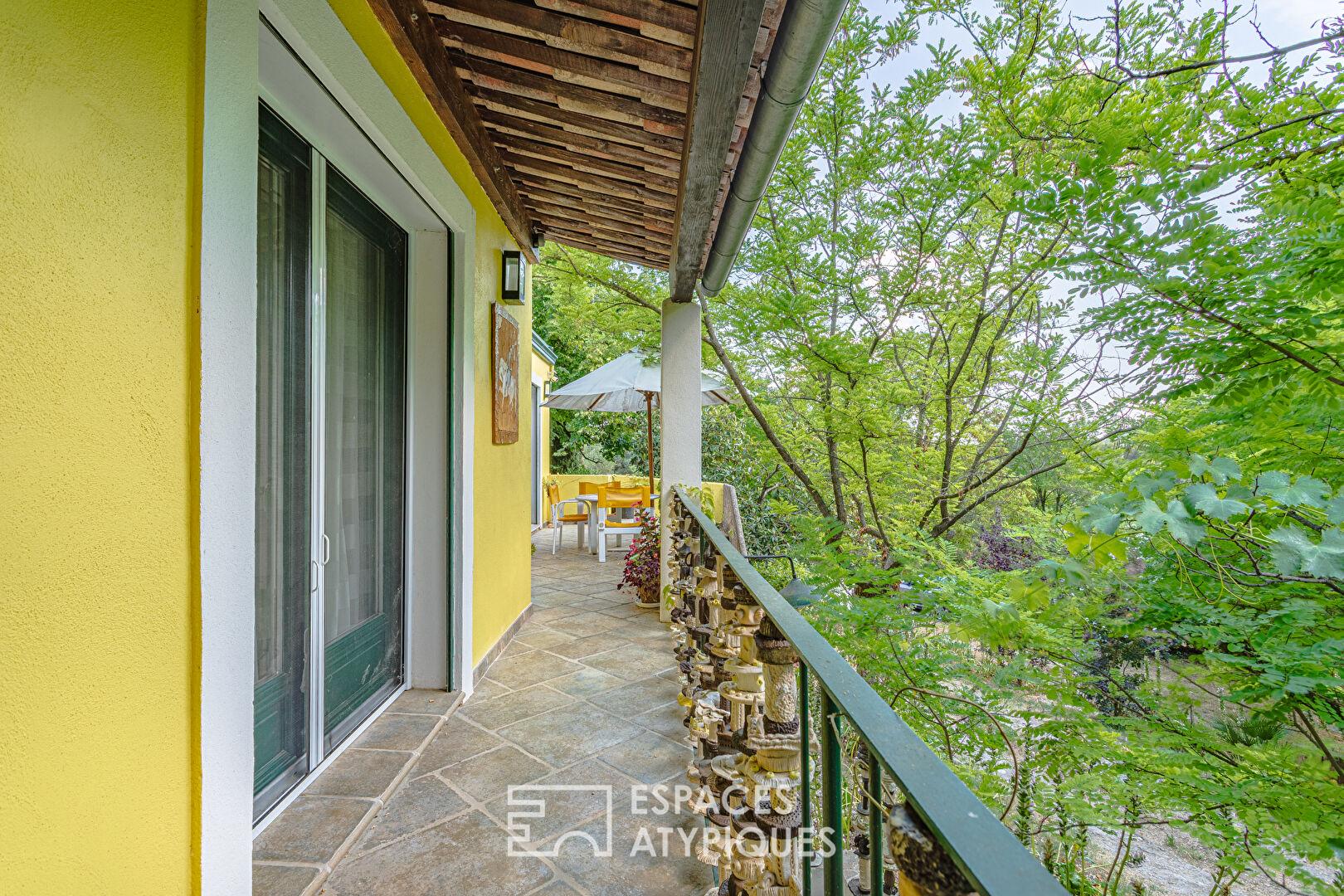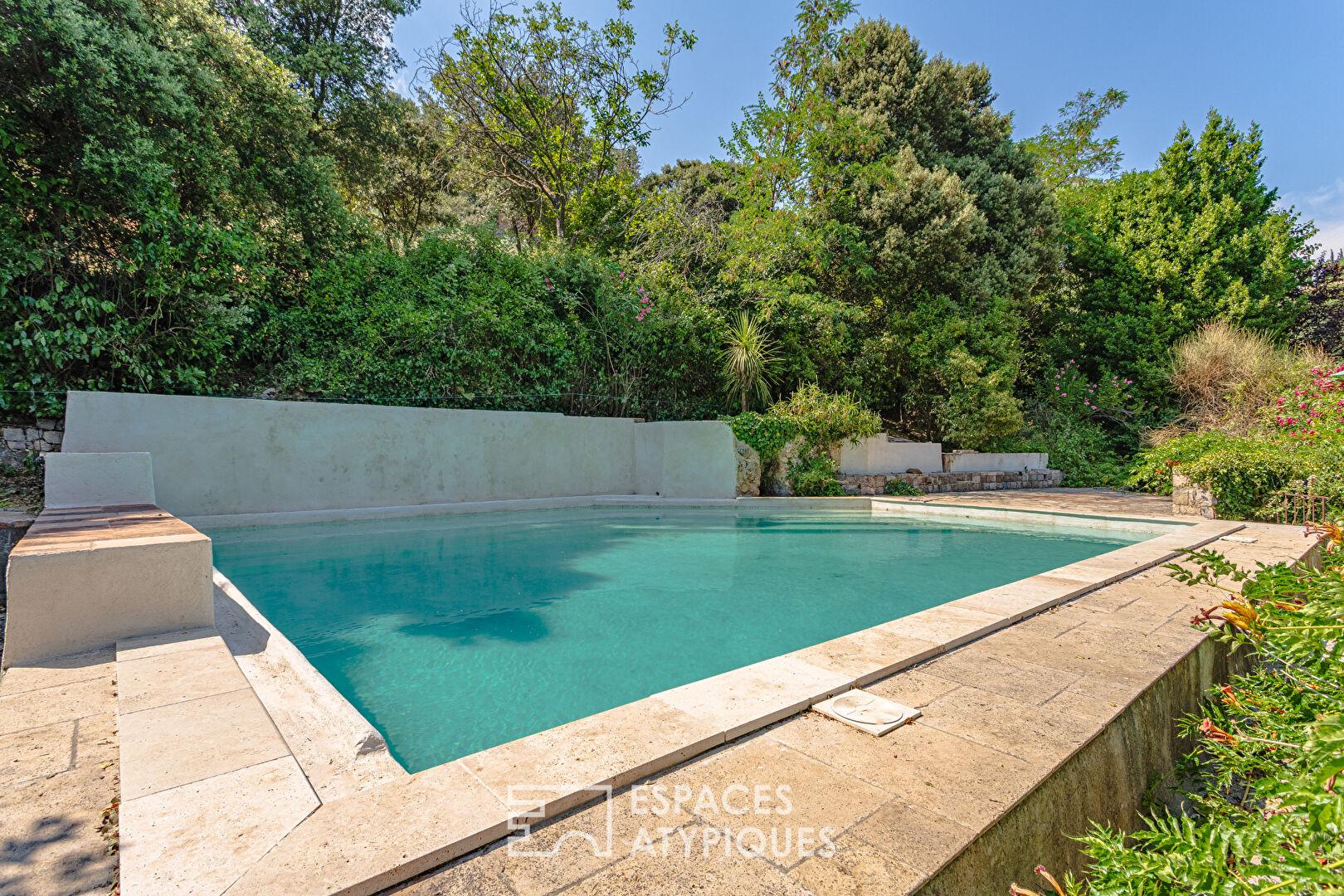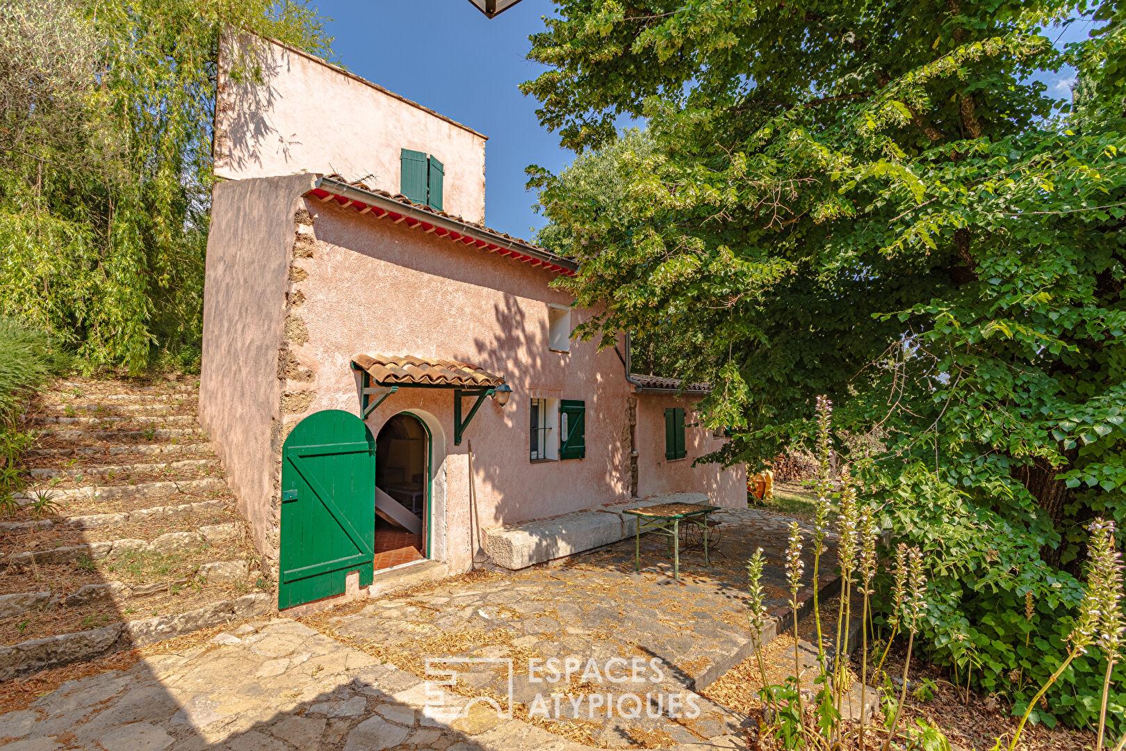 À l’extérieur, le jardin se transforme en un véritable parcours sensoriel, ponctué de ruisseaux alimentés par l’eau de Saint-Martin. Des oliviers permettent la production d’huile d’olive maison, tandis que kakis, cerisiers, abricotiers, mûriers et figuiers complètent ce verger d’exception. Un poulailler, un garage et plusieurs ateliers enrichissent cet espace en parfaite symbiose avec la nature.