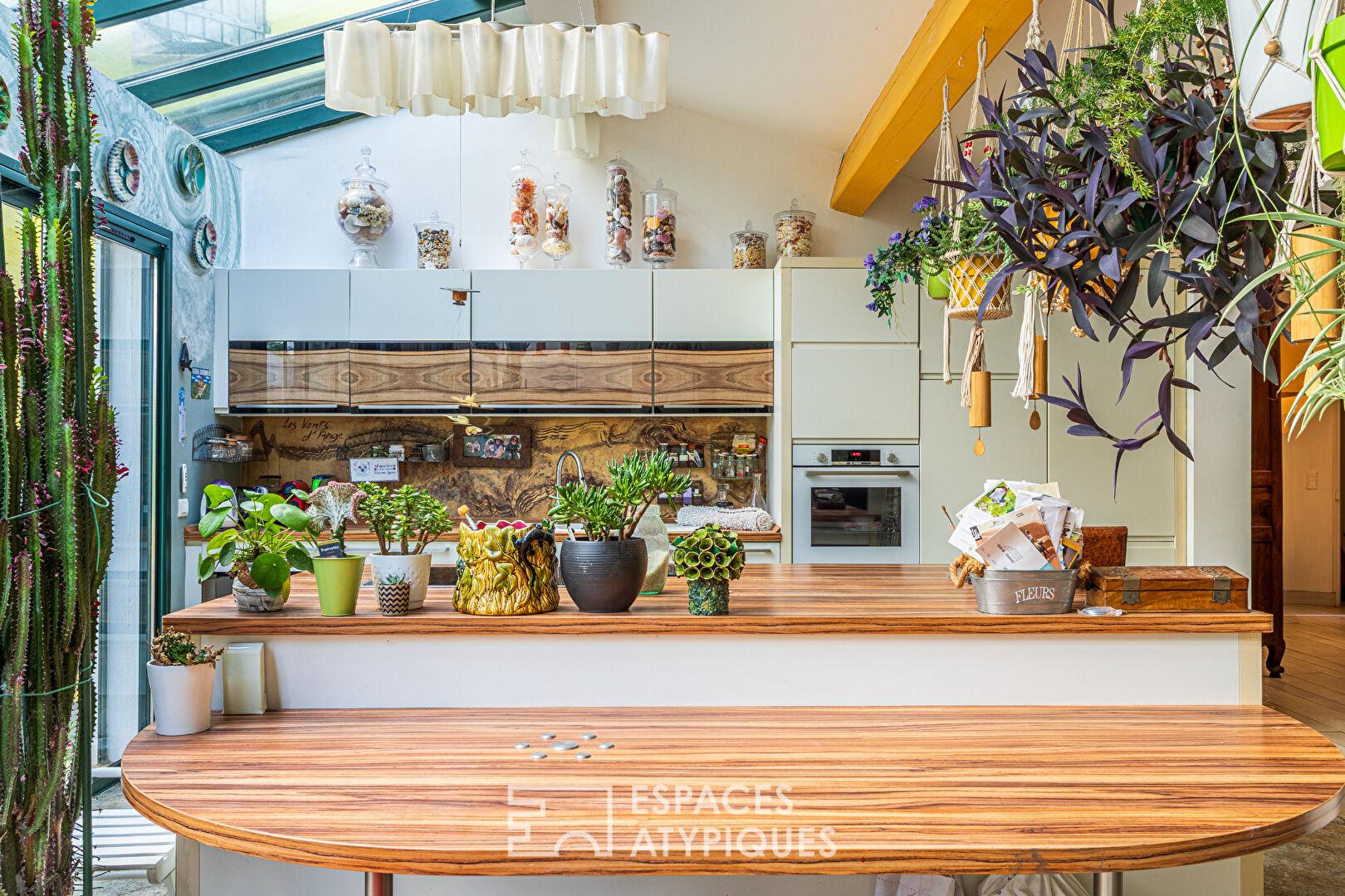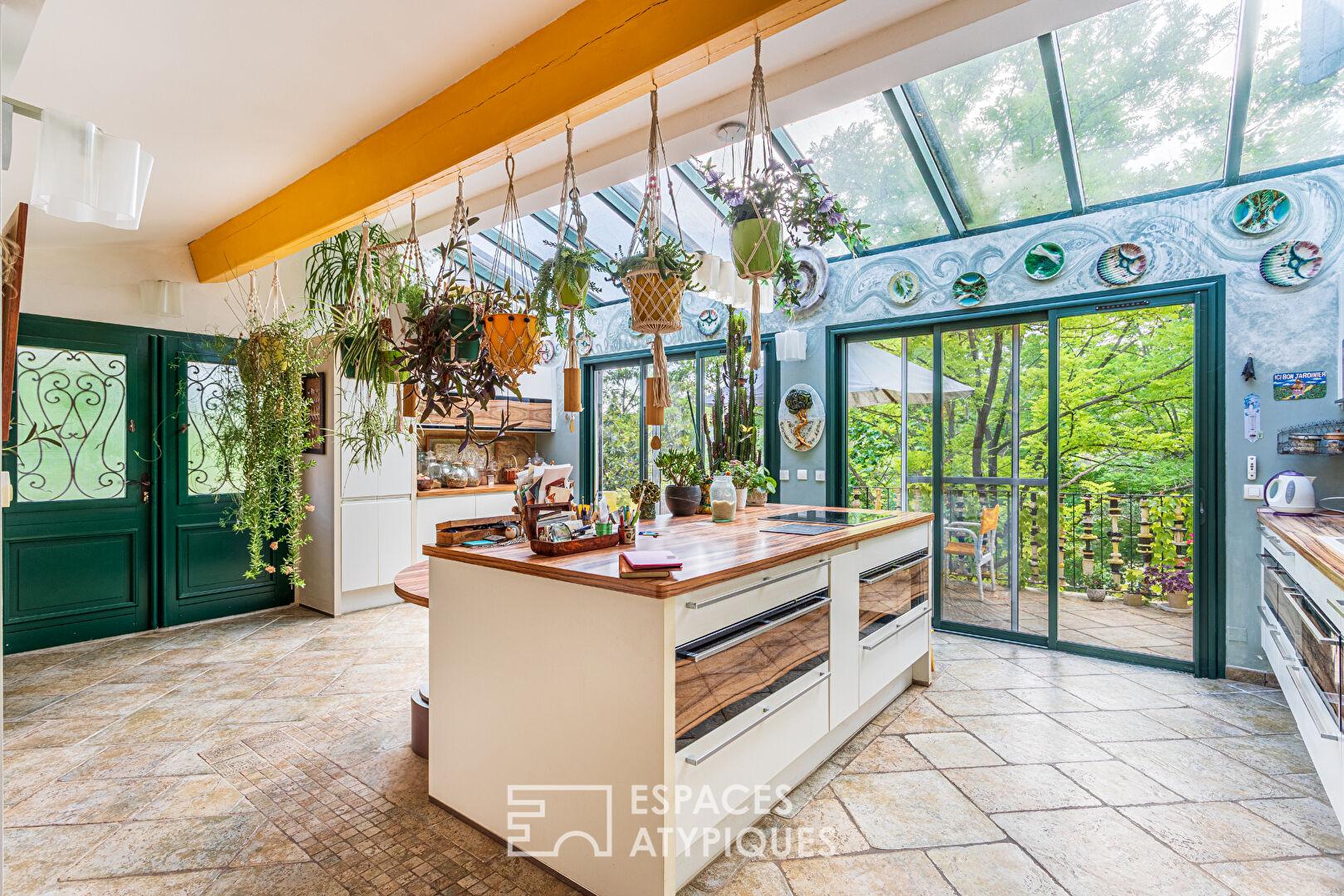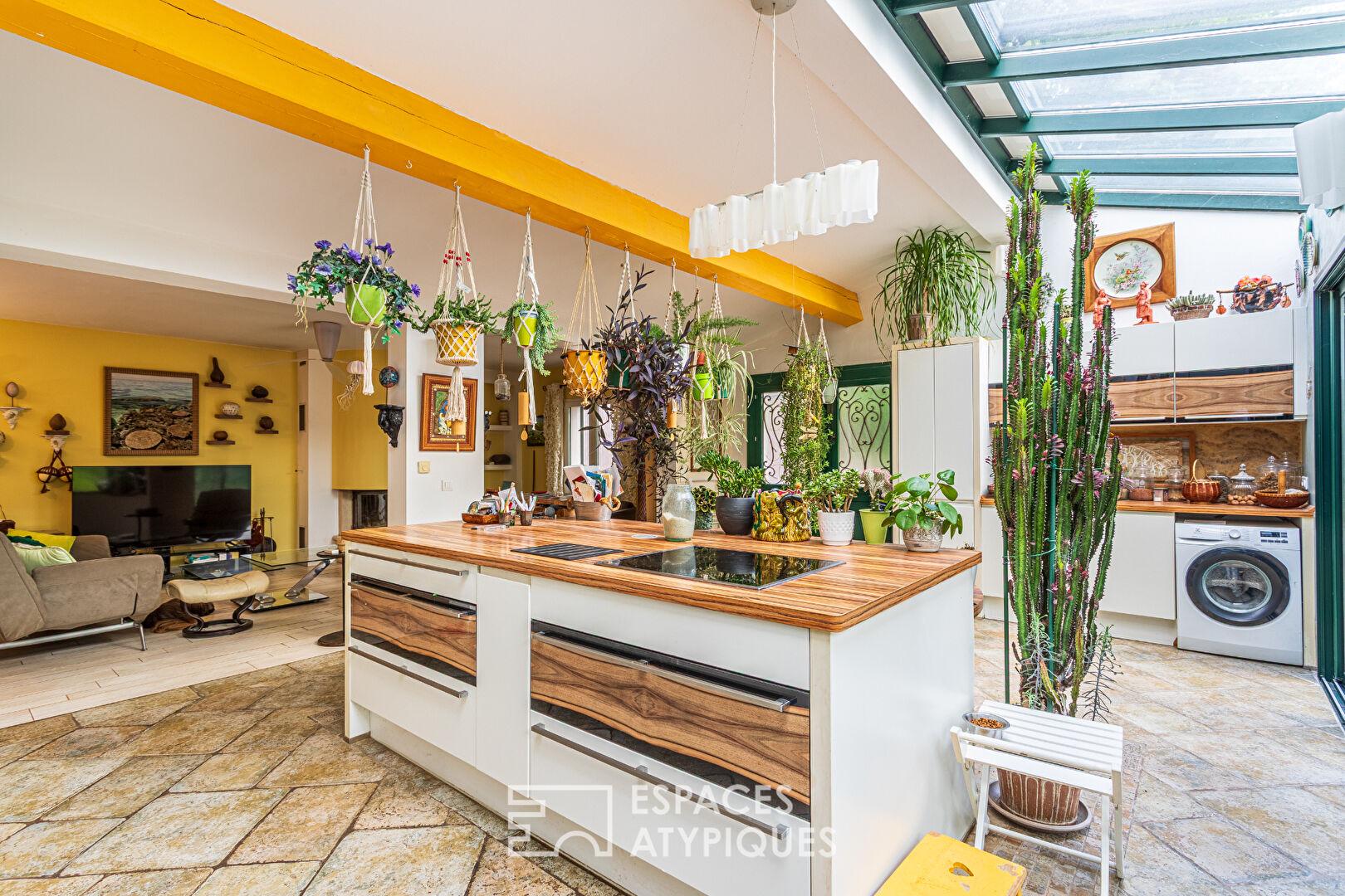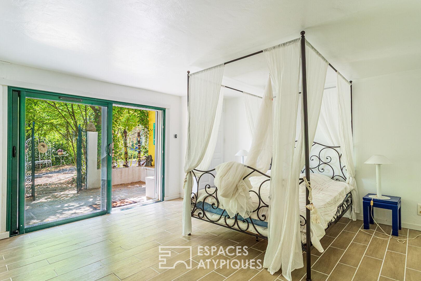 La maison principale, construite dans les années 80, se distingue par ses volumes généreux et son agencement fonctionnel. Une cuisine sous véranda, moderne et équipée, baignée de lumière naturelle, s’ouvre sur un salon chaleureux avec cheminée. À ce même niveau, une suite parentale offre un espace intime et confortable. L’étage inférieur accueille trois chambres avec accès extérieur, partageant une salle de bain. Au dernier niveau, un espace bureau et une chambre complètent l’ensemble. Un atelier d’artiste ajoute une touche inspirante à cette demeure au caractère affirmé.