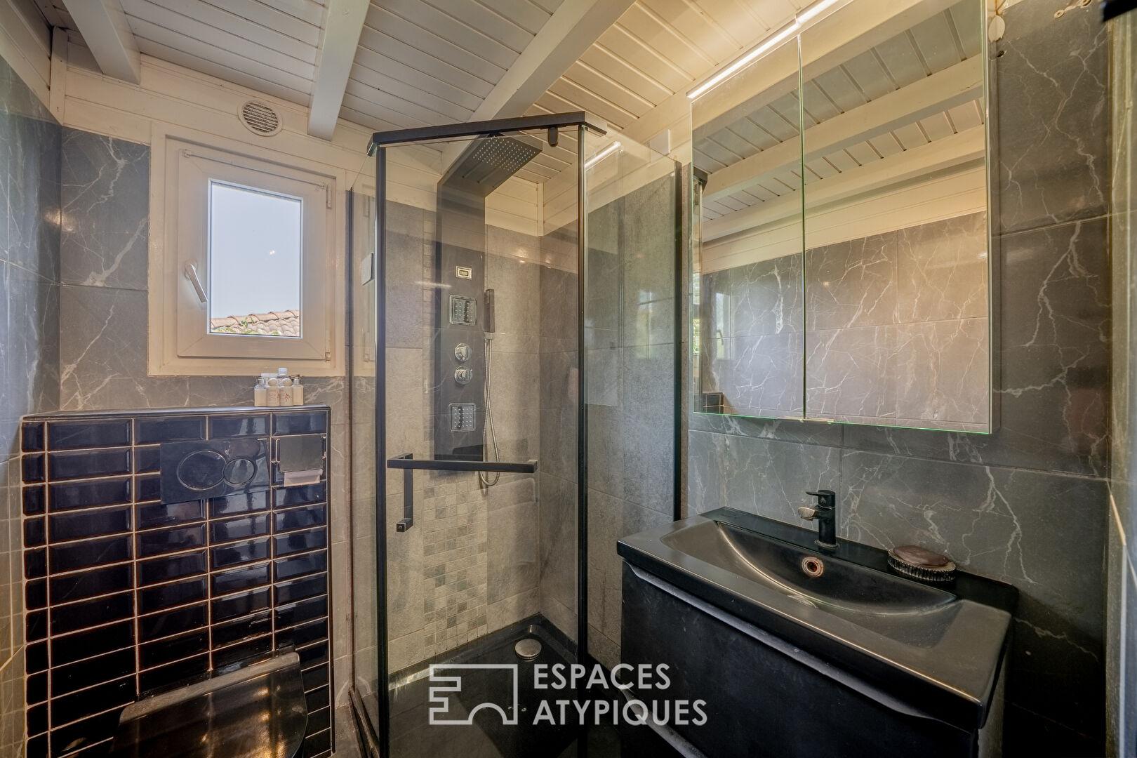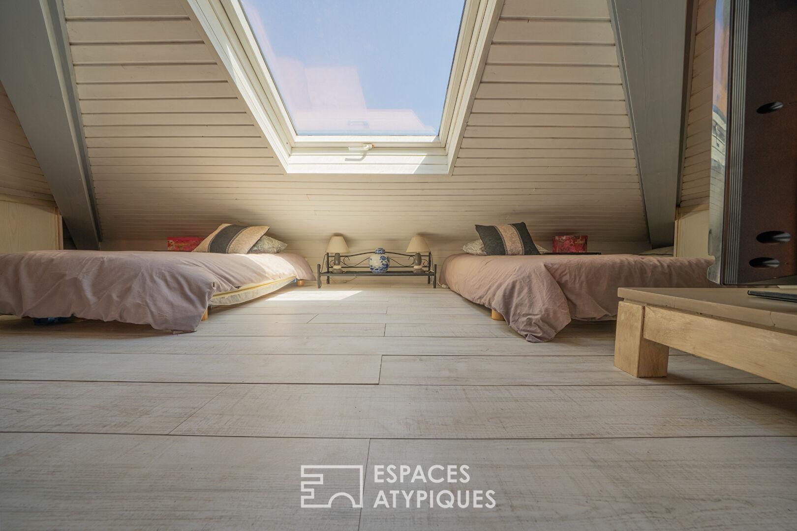 Le coin nuit se compose de deux chambres lumineuses et d’une salle d’eau fonctionnelle. Atout supplémentaire renforçant le caractère atypique du lieu, une mezzanine ingénieuse, éclairée par son propre Velux, offre un espace de couchage d’appoint privilégié pour les enfants. Cet agencement fluide et optimisé mêle avec succès le cachet authentique du bois à une atmosphère de vie moderne.