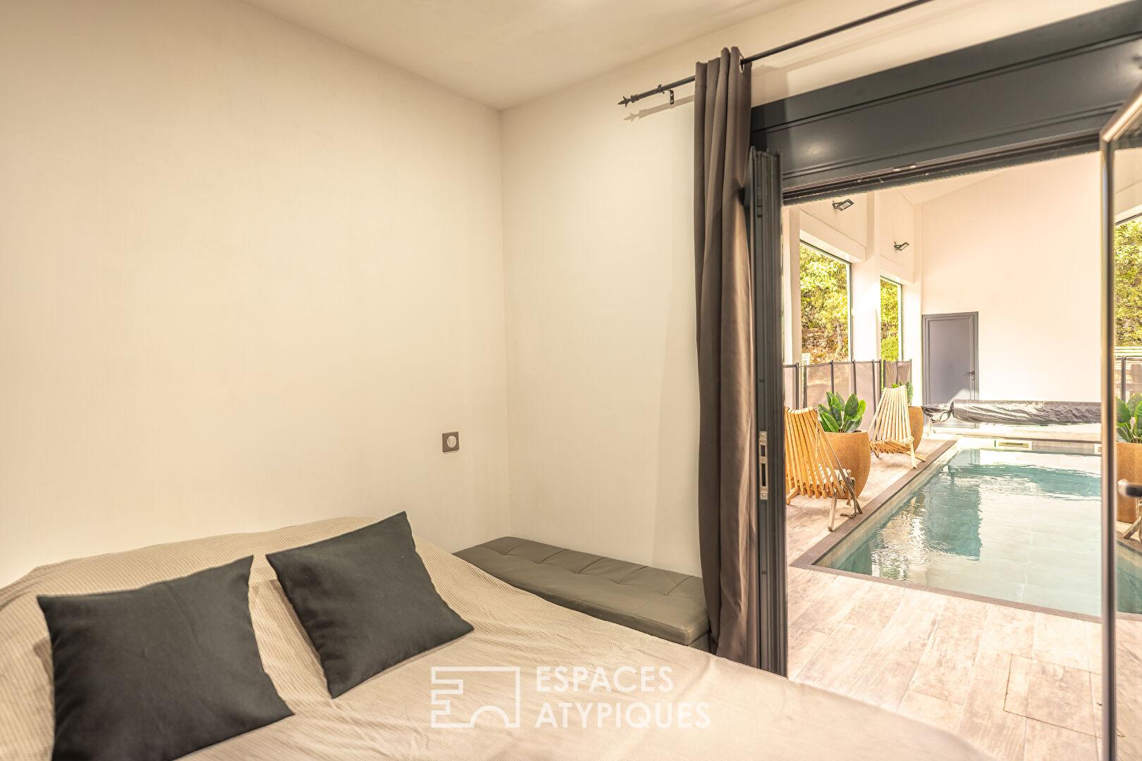 La maison principale offre cinq chambres dont une suite parentale avec accès direct à la piscine intérieure.