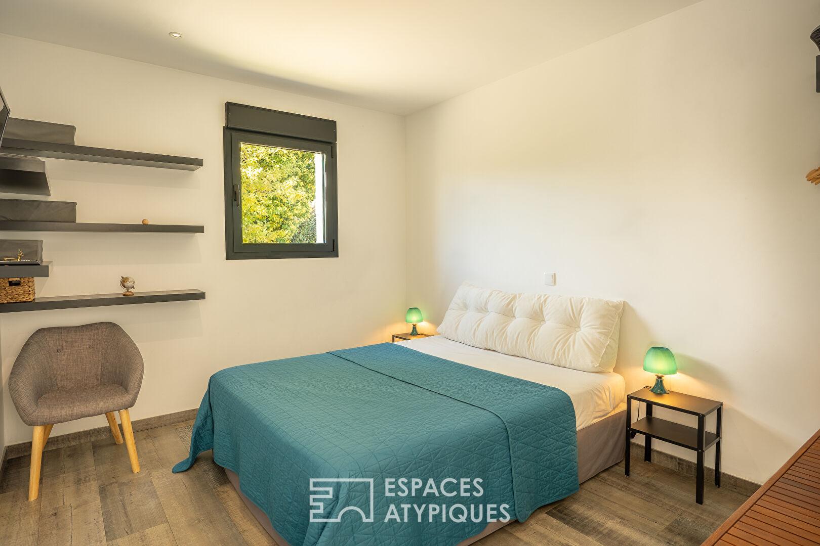 Conçue comme une vaste maison familiale d’environ 400 m², cette propriété comprend une bâtisse principale accompagnée de trois suites indépendantes, pensées pour accueillir famille et amis en toute intimité, ou pour être exploitées en chambres d’hôtes. Chacune dévoile un espace de vie complet : séjour, cuisine équipée, chambre, salle d’eau, et toilettes indépendantes, terrasses privatives avec jacuzzi. L’une d’elles bénéficie en supplément d’une mezzanine pouvant accueillir trois couchages. Le tout est meublé et décoré avec soin, dans un esprit chaleureux et contemporain.