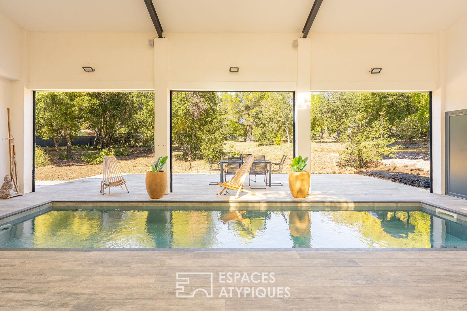 La piscine intérieure, équipée d’une nage à contre-courant, se love dans une spectaculaire structure métallique de 80 m² esprit loft, ouverte sur la nature environnante. Un espace de vie unique où l’intérieur dialogue sans cesse avec l’extérieur.