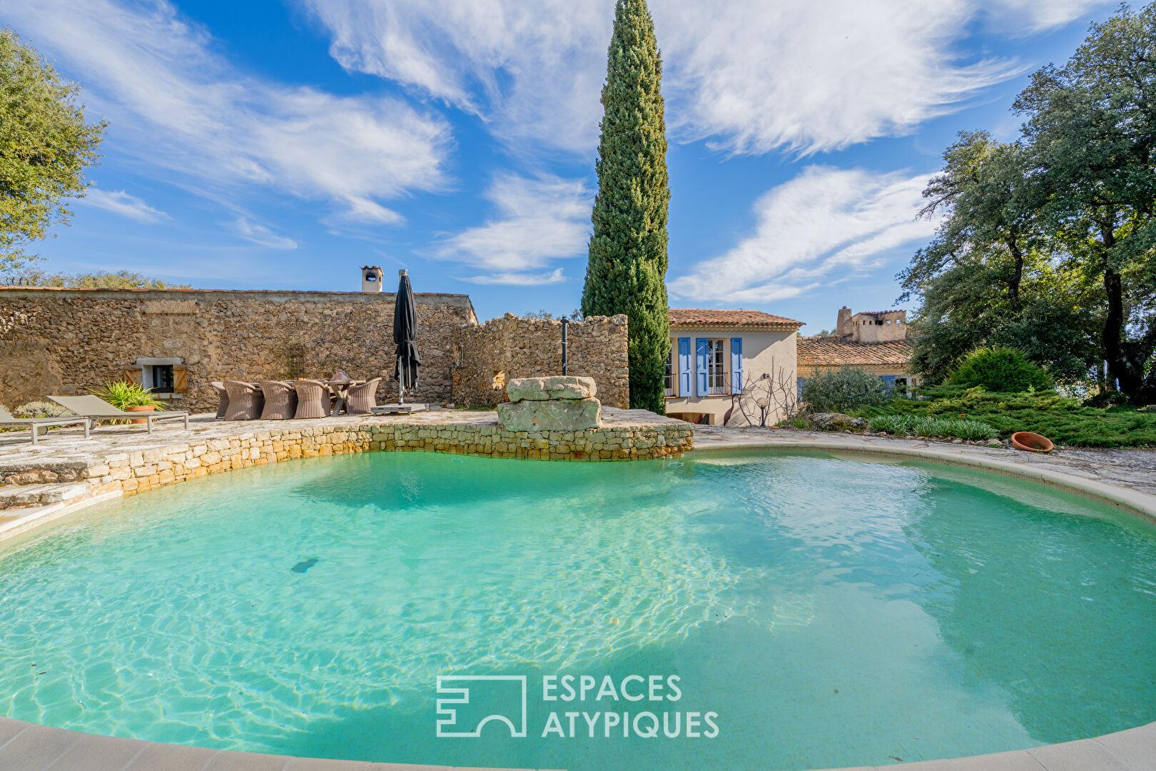 Le terrain de 9660 m², véritable havre de biodiversité, abrite un potager, un poulailler et une grotte naturelle, renforçant le caractère insolite de ce lieu. Les terrasses en pierre et la piscine au sel s’intègrent parfaitement à la topographie, offrant des espaces de contemplation face aux collines varoises.