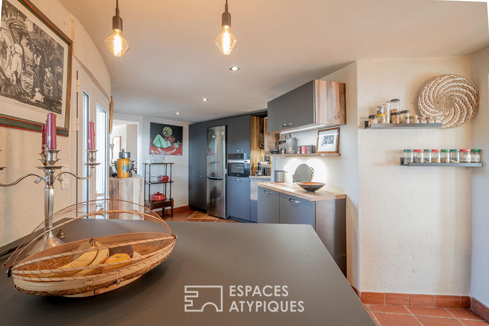 Trois chambres, dont un bureau, composent l’espace nuit, complété par une cave à vin taillée dans la roche, une buanderie et une pergola bioclimatique surplombant la vallée.