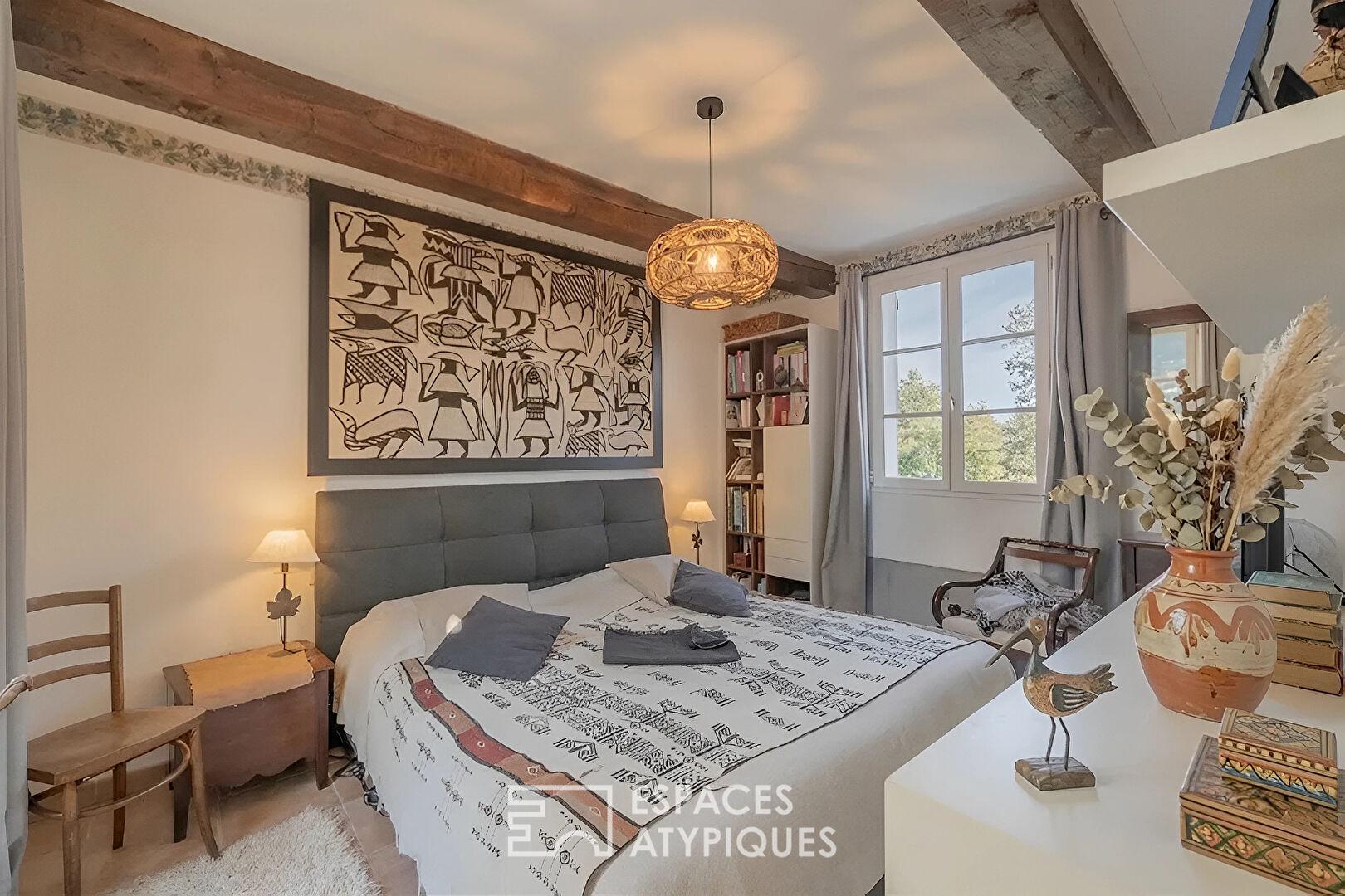 La bergerie attenante, véritable refuge de caractère avec ses poutres apparentes, propose un confort indépendant avec deux chambres, une salle d’eau et une cave voûtée aménagée en alcôve d’invités, idéale pour recevoir en toute intimité.