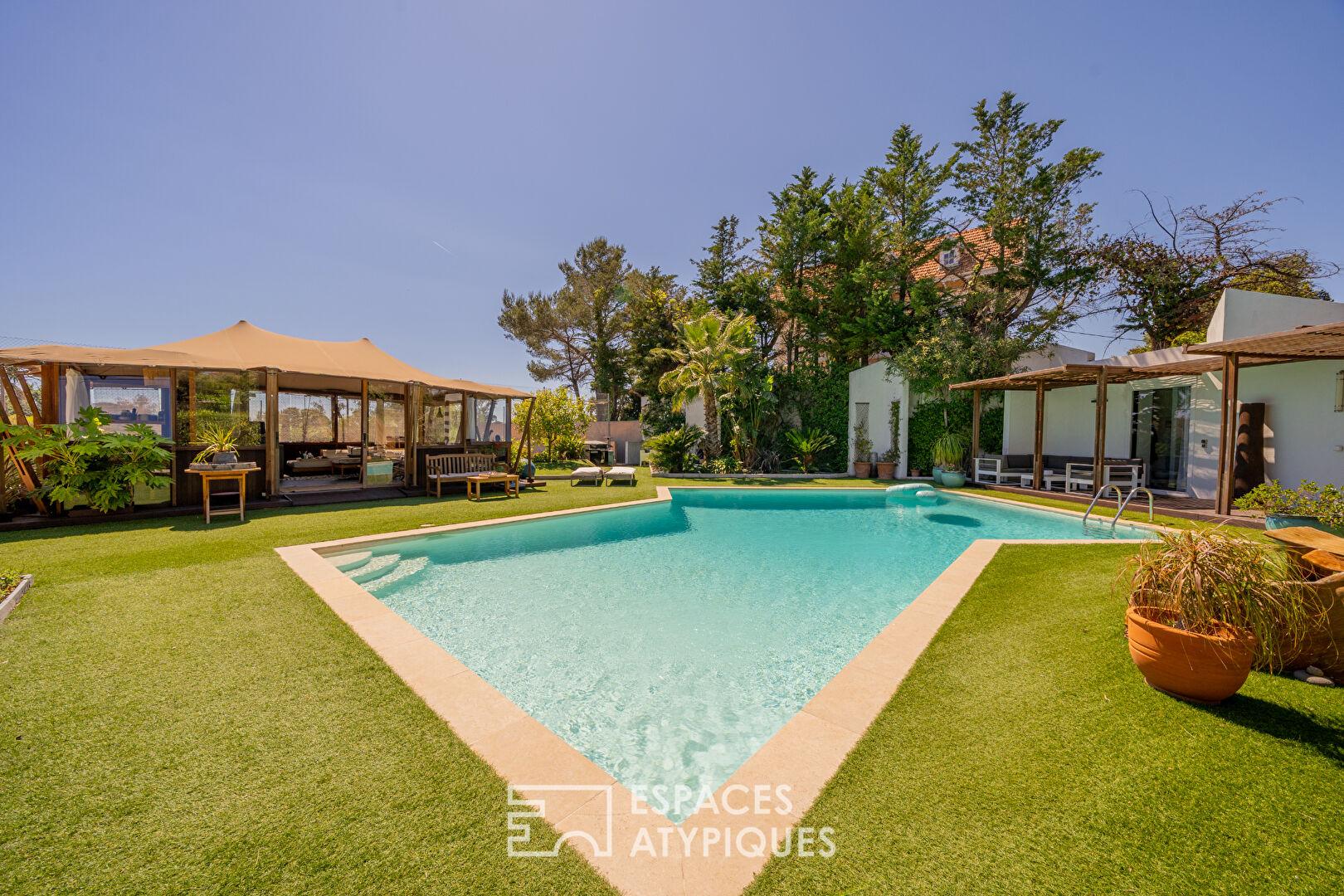 À l’extérieur, la piscine s’intègre harmonieusement aux terrasses et se prolonge par un pool house esprit lodge safari, entièrement aménagé, invitant à des moments de convivialité en toute saison.