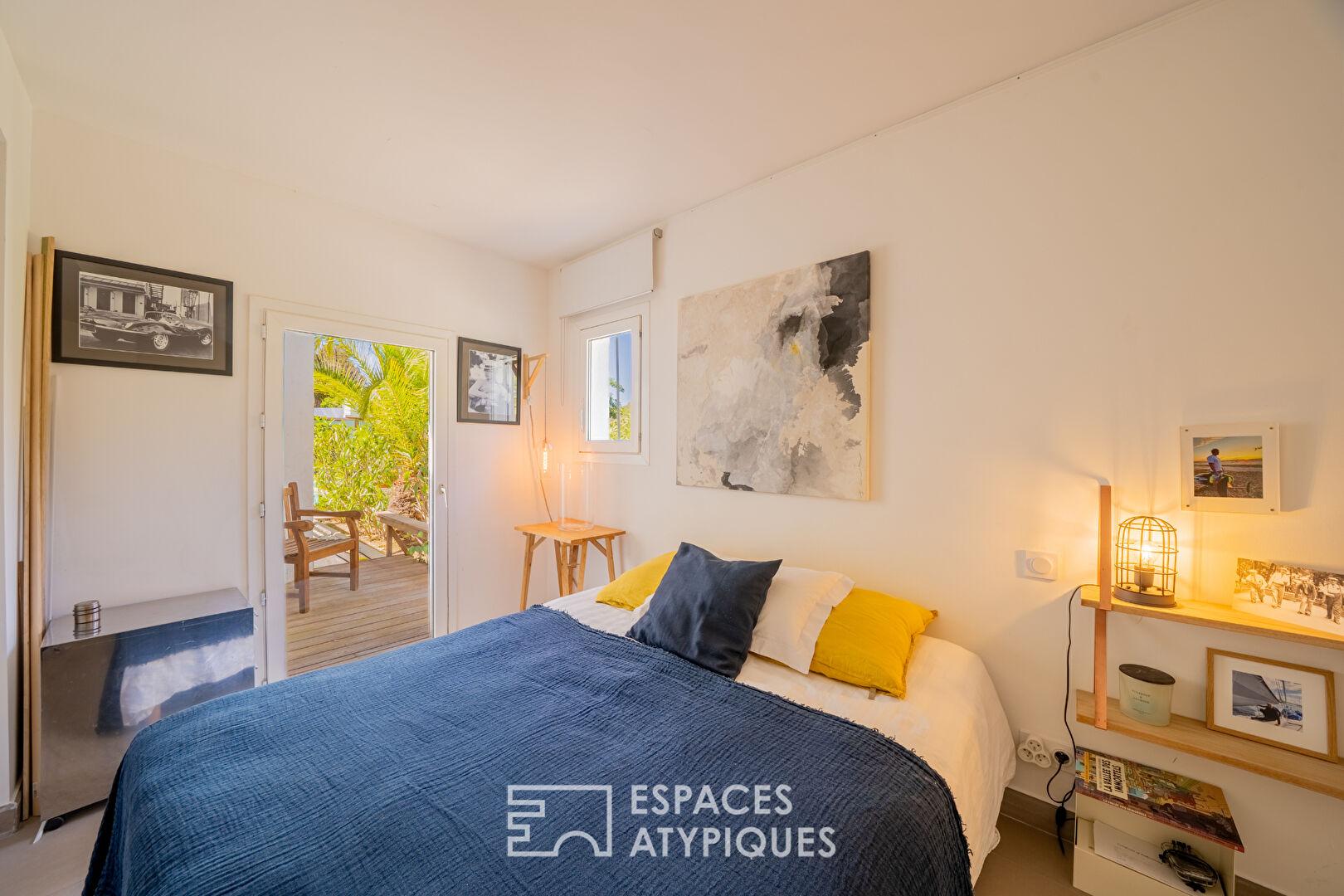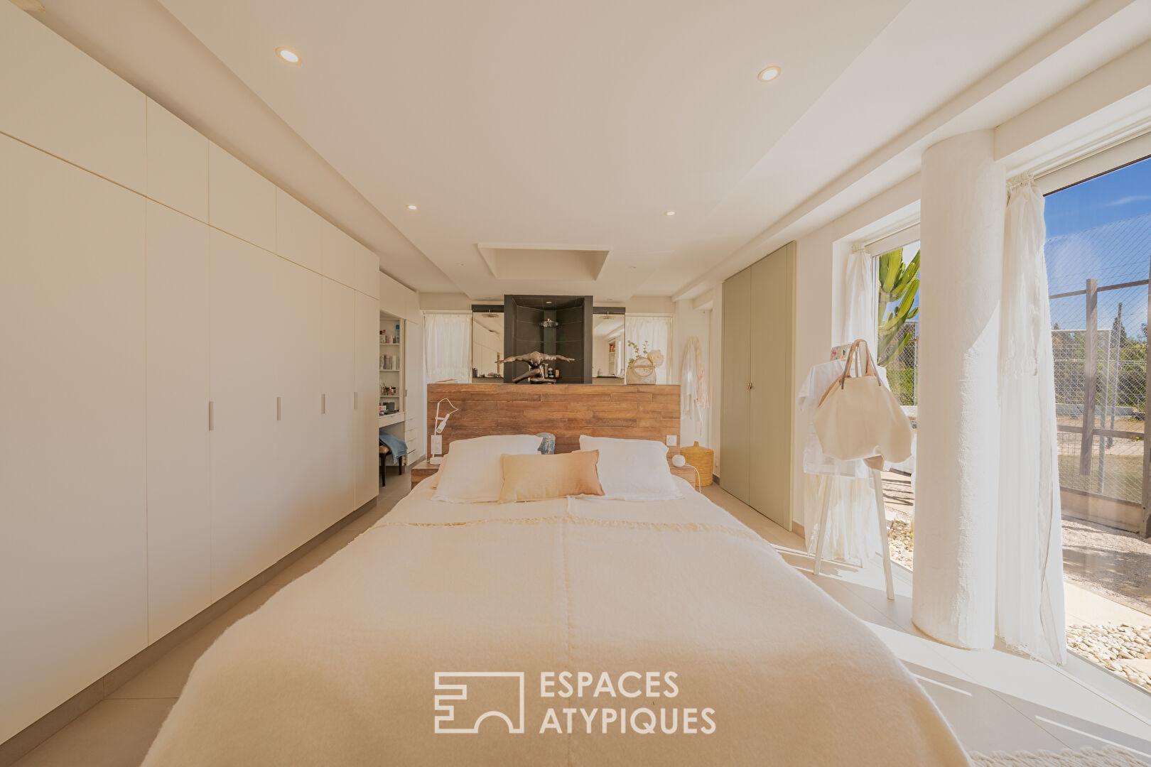 Édifiée sur un terrain d’environ 3 000 m², la villa principale de plain-pied développe environ 113 m². Elle s’organise autour d’une vaste pièce de vie de 51 m², dont la configuration angulaire apporte rythme et caractère aux volumes, sublimés par une lumière naturelle douce.