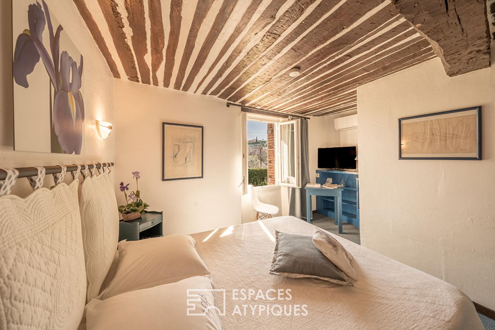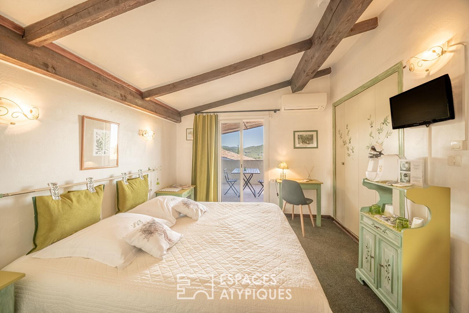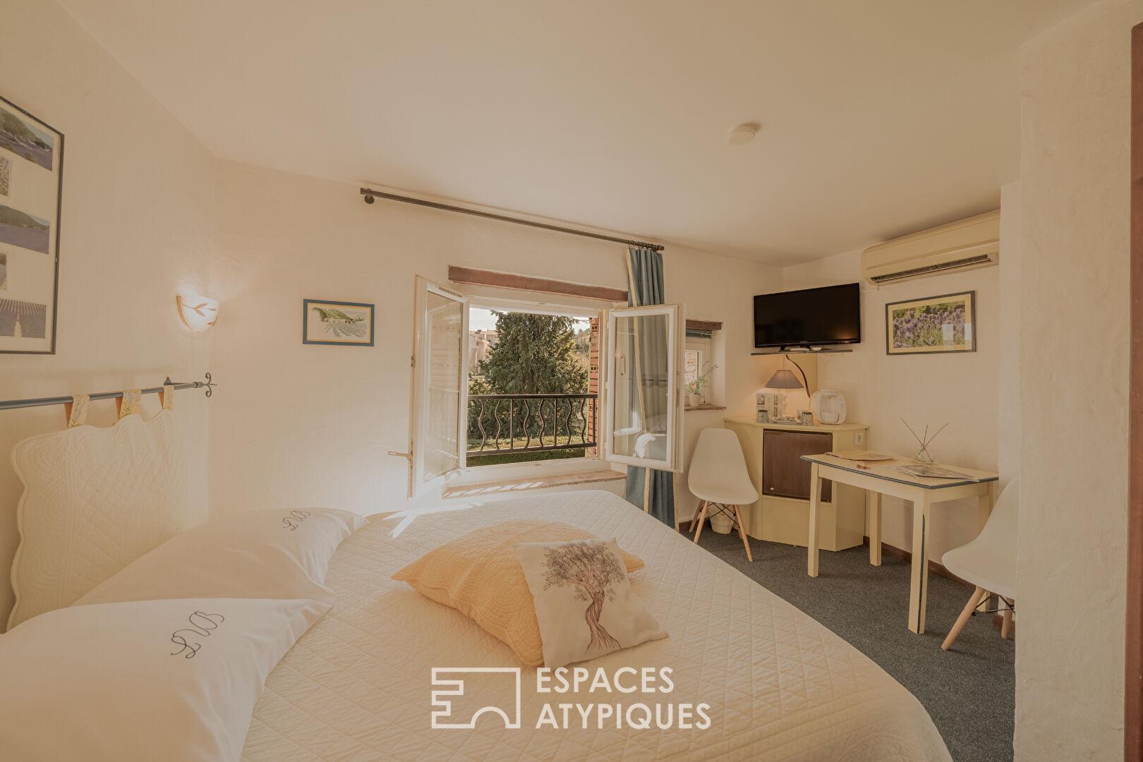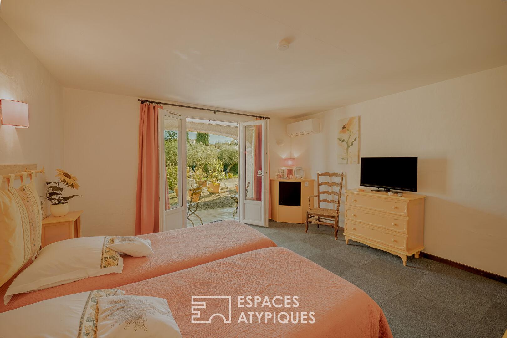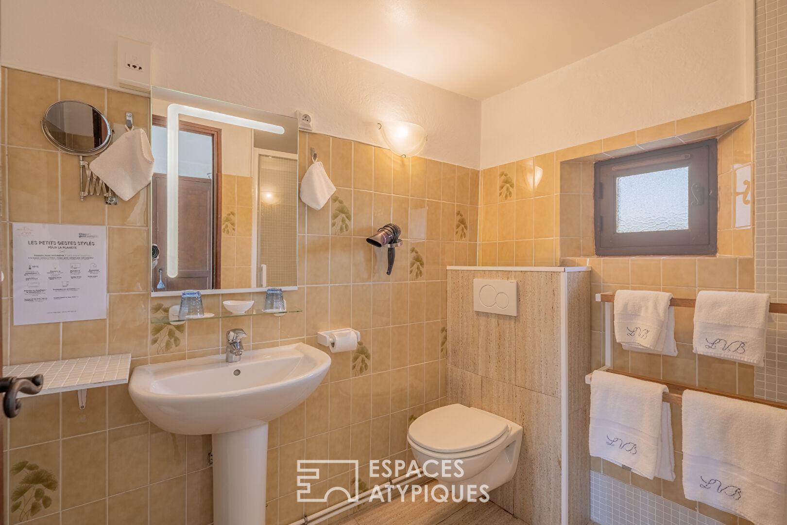 Conçue pour un projet d’accueil touristique, la bâtisse offre une capacité d’hébergement remarquable : l’ancienne tour de la bergerie abrite trois chambres d’hôtes de caractère, tandis que quatre suites en rez-de-jardin et un studio indépendant complètent l’offre. Chaque espace dispose de ses propres commodités.