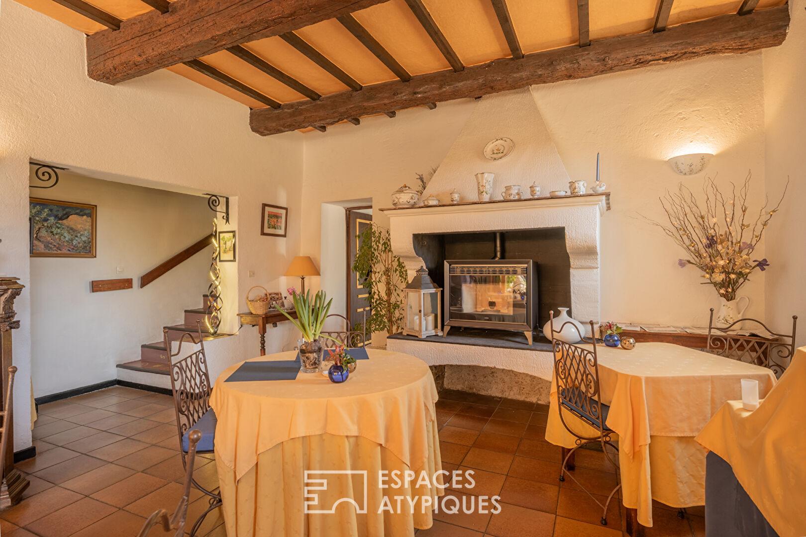 L’architecture intérieure de ce bien atypique célèbre l’authenticité à travers des poutres apparentes et une cheminée monumentale qui trône dans la vaste salle de restaurant. Le rez-de-chaussée s’articule autour d’un salon avec bar et d’une salle de réception, parfaits pour la convivialité.
