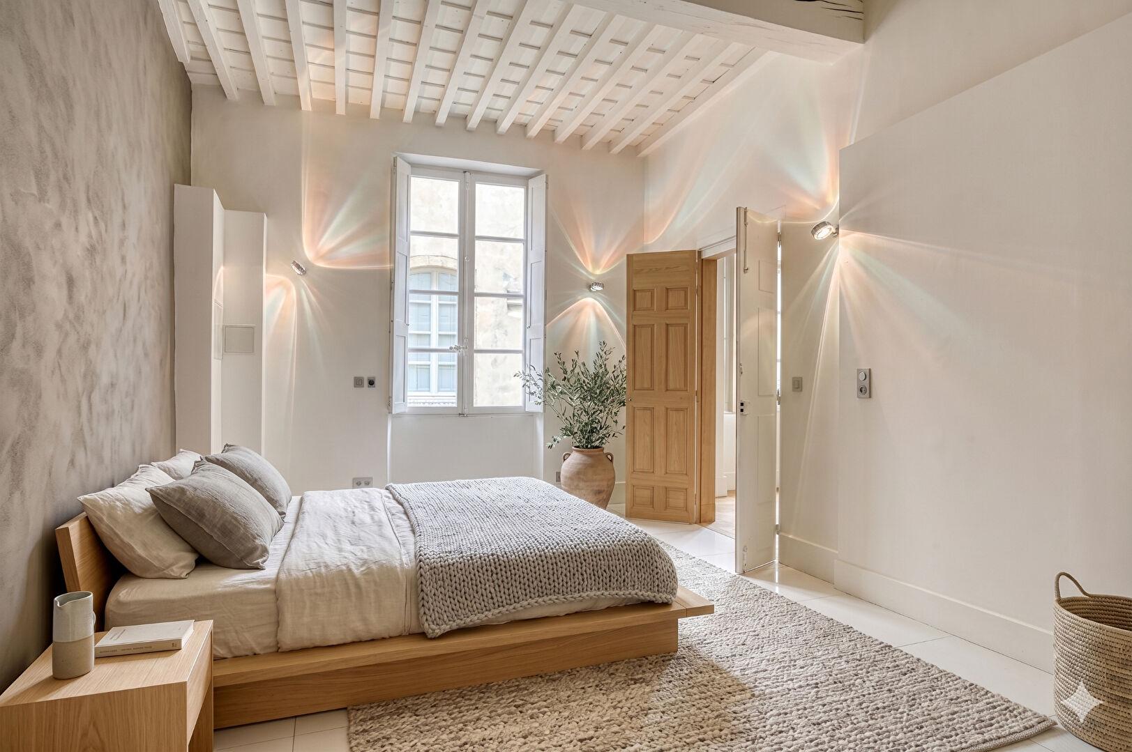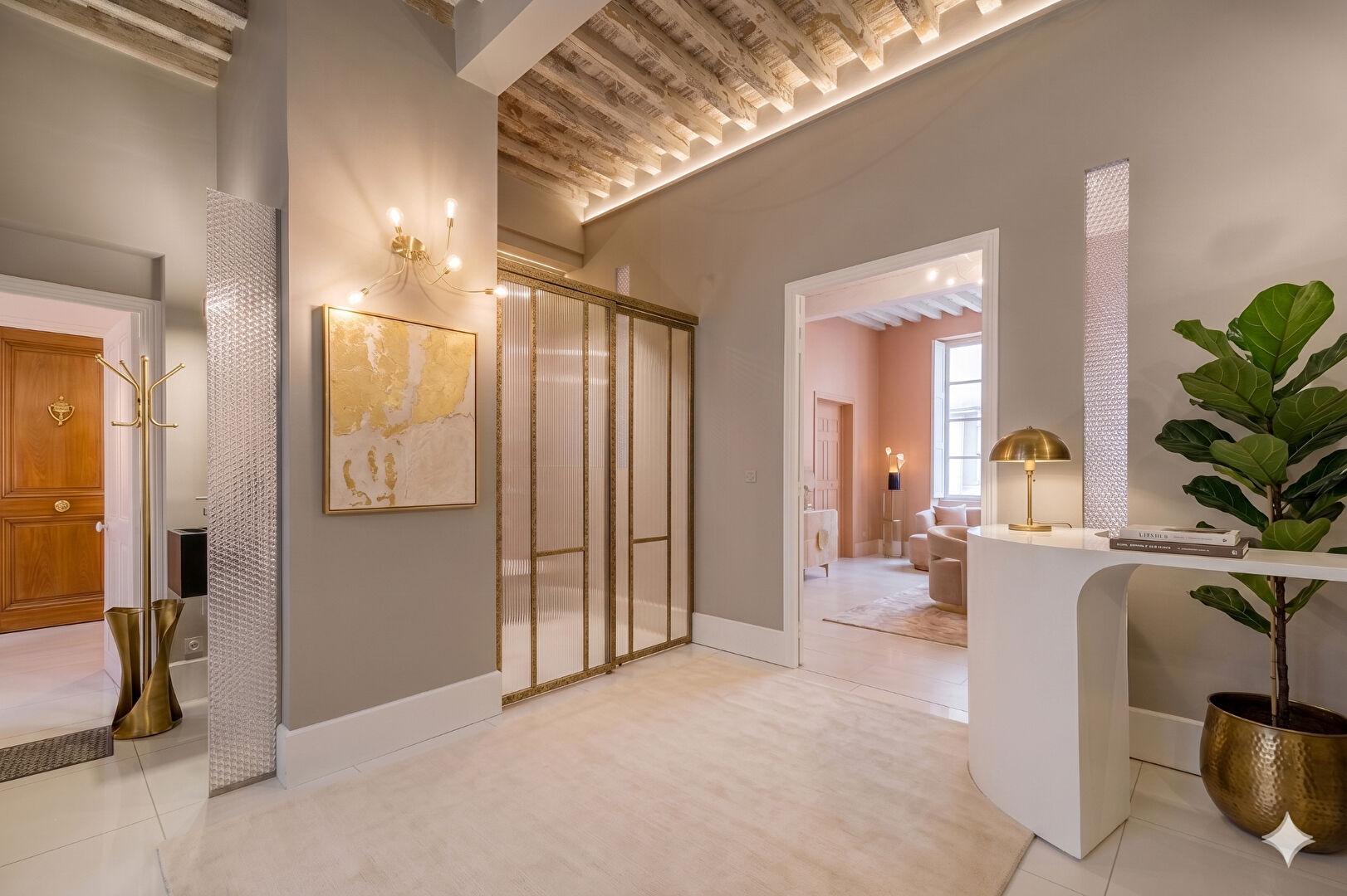 Dès l’entrée, les teintes audacieuses et lumineuses soulignent les beaux volumes et offrent des perspectives originales. Traversant et au calme, l’appartement s’organise autour d’une vaste entrée, pouvant également faire office de bureau, ouverte sur un jardin intérieur commun, à l’ombre du palais épiscopal.