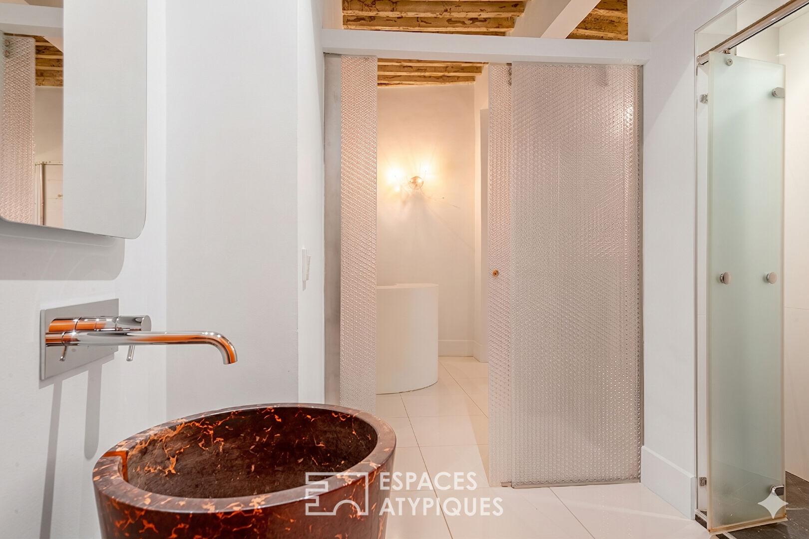 La distribution des espaces, sublimée par près de quatre mètres de hauteur sous plafond, accentue la sensation de volume et confère à l’ensemble une atmosphère à la fois élégante et résolument contemporaine.