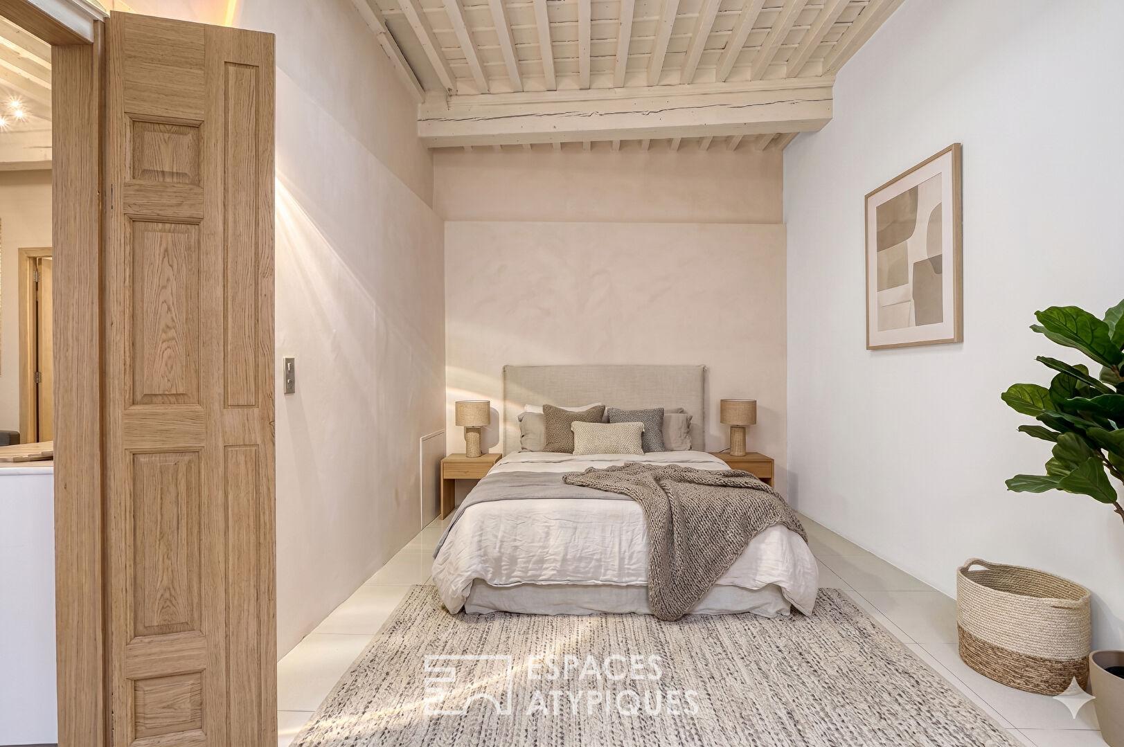 La pièce de vie principale, aux nuances chaleureuses, accueille un spacieux salon avec cuisine entièrement équipée, véritable coeur de l’appartement. À droite, une grande chambre sublimée par une cheminée en marbre du XVIIIe siècle propose un univers nuit aux tonalités bleu turquoise.