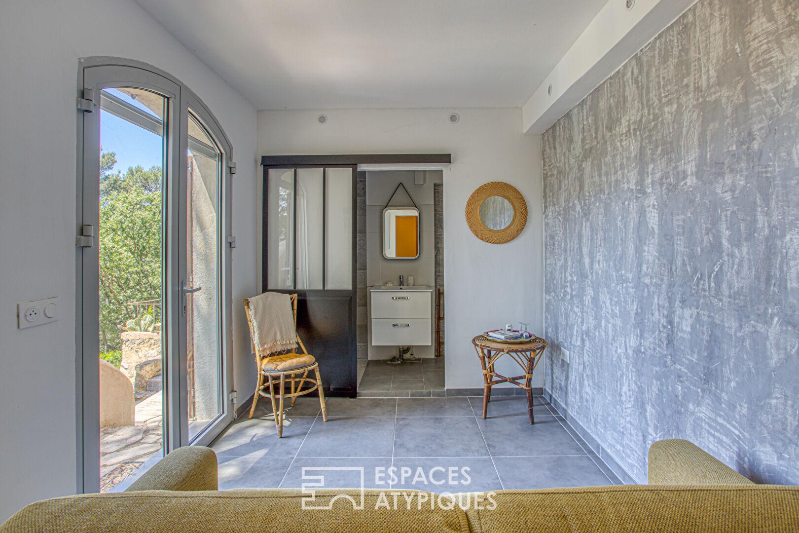En rez-de-jardin, deux logements indépendants complètent l’ensemble : un appartement de 45 m² avec salon, cuisine, chambre et salle de bain, ainsi qu’une chambre de 25 m² avec salle d’eau, dressing et accès terrasse. Ces espaces peuvent accueillir famille, amis ou être valorisés dans le cadre d’une activité locative saisonnière.