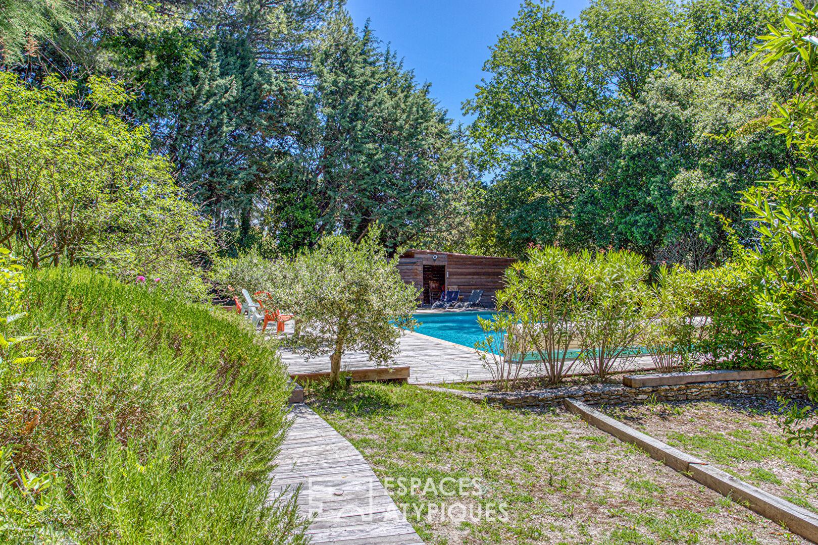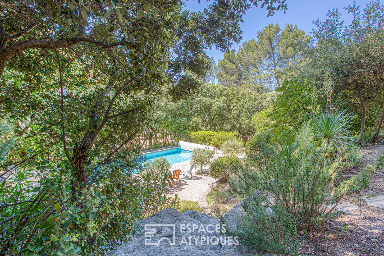 Le jardin, délicatement paysagé et ponctué d’oliviers s’étage autour de restanques en pierre sèche, d’essences méditerranéennes et d’escaliers bucoliques menant à une grande piscine (11 x 6 m) et son pool-house, nichés à l’abri des regards.