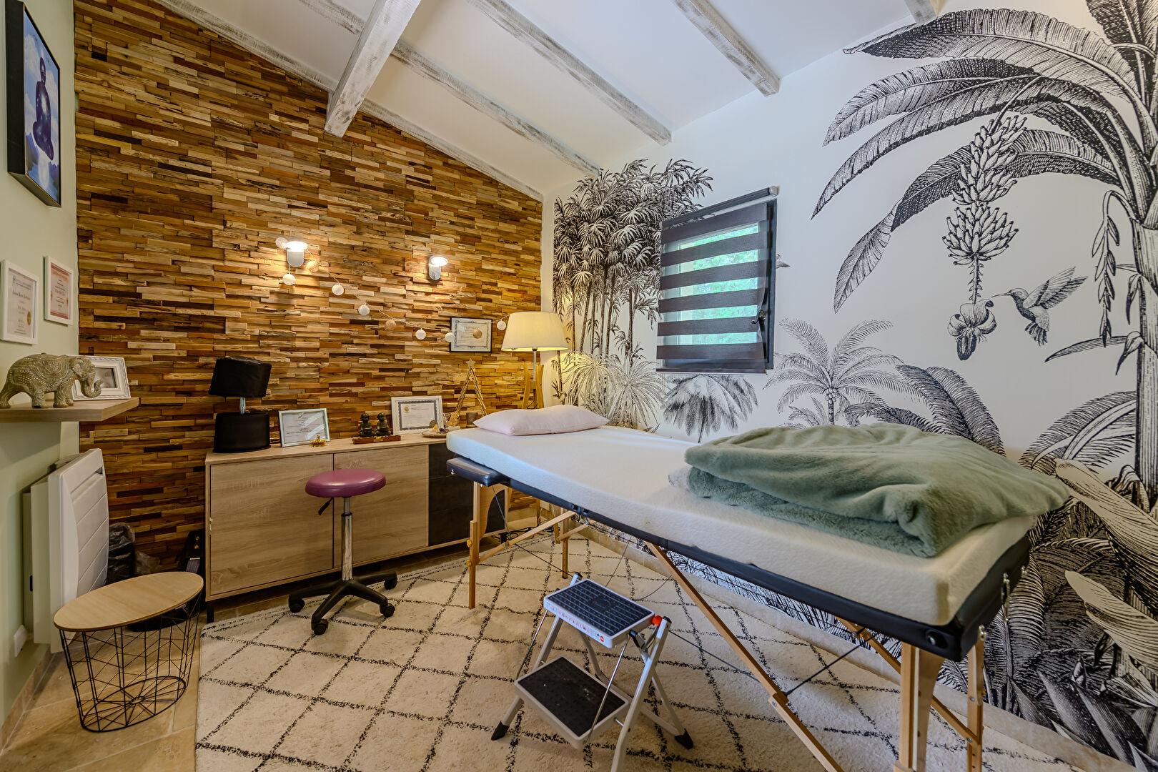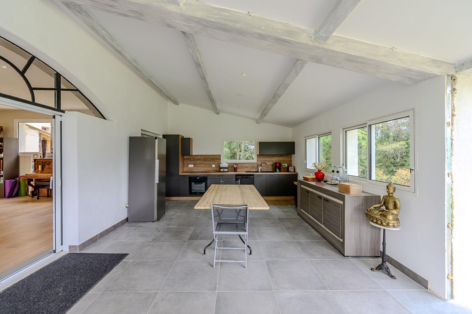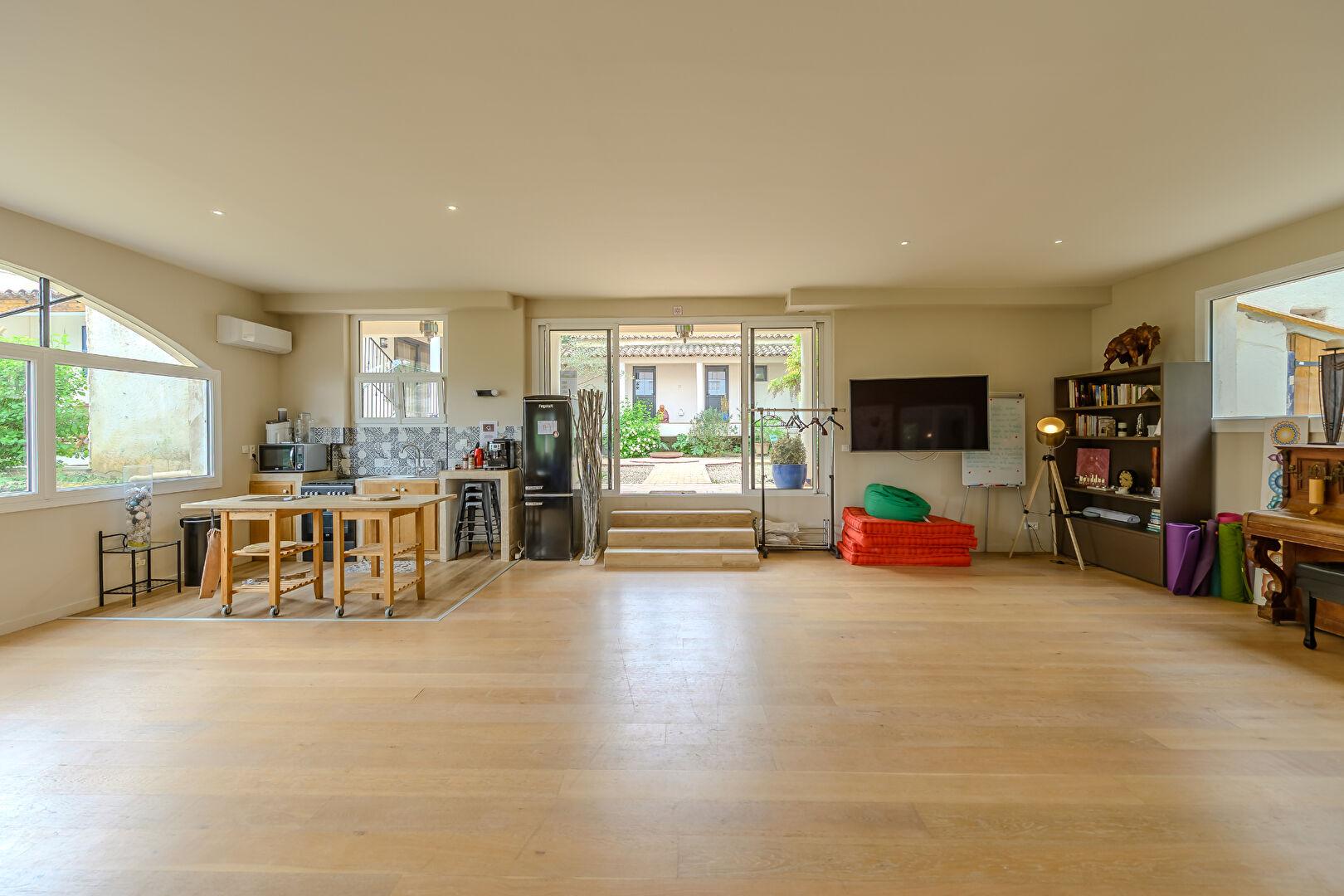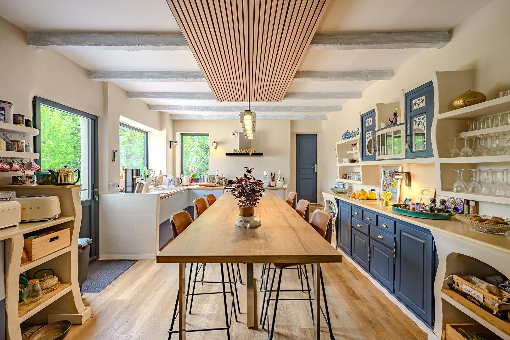 Dans son prolongement, une vaste pièce de 64 m² en parquet, ouverte sur l’extérieur, dialogue avec une cuisine d’été entièrement équipée d’environ 50 m², installée sous une terrasse ombragée. Cet ensemble forme un espace de réception remarquable, idéal pour accueillir, organiser des retraites ou partager des moments de convivialité dans un cadre unique.