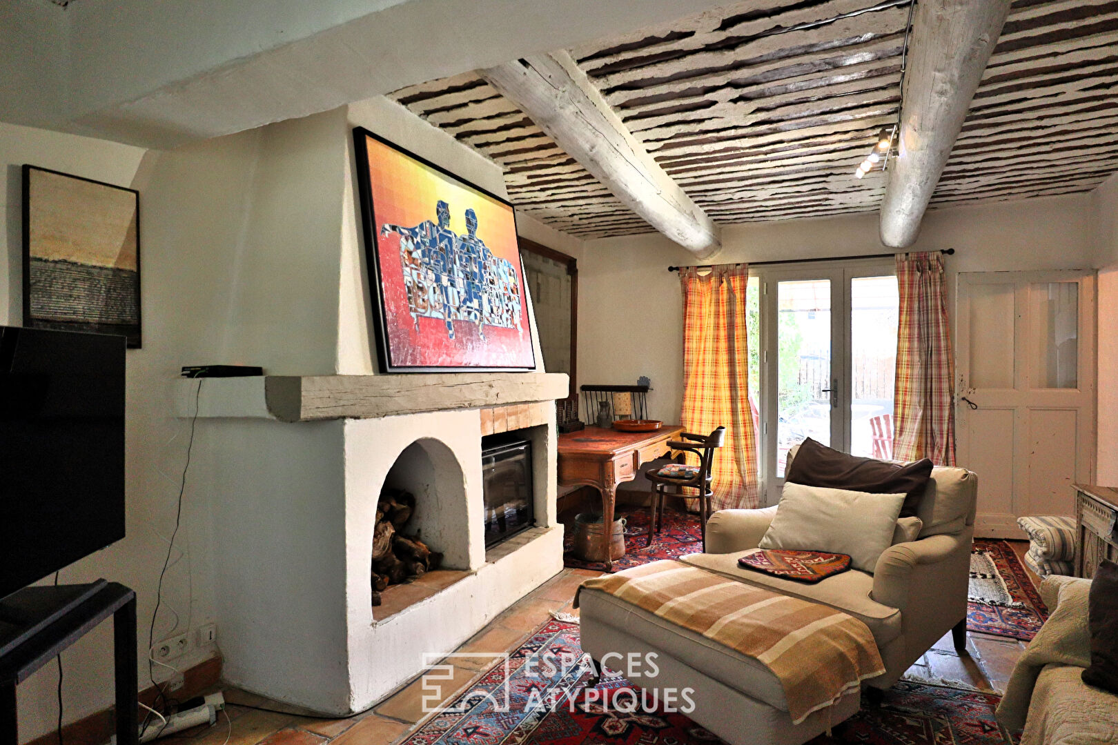 L’entrée distribue l’accès aux pièces de vie. La cuisine, aménagée dans un esprit provençal authentique, invite à la convivialité. Une cheminée à foyer ouvert trône fièrement, parfaite pour cuisiner à l’ancienne ou simplement réchauffer l’atmosphère lors des soirées d’hiver. Deux portes-fenêtres s’ouvrent sur le jardin d’un côté, et sur une charmante terrasse ombragée au nord de l’autre, pour multiplier les moments de détente au fil de la journée.