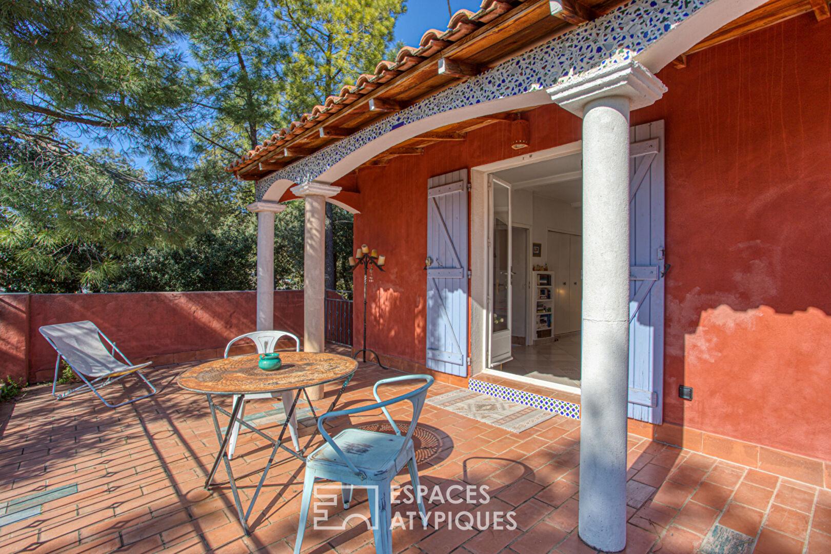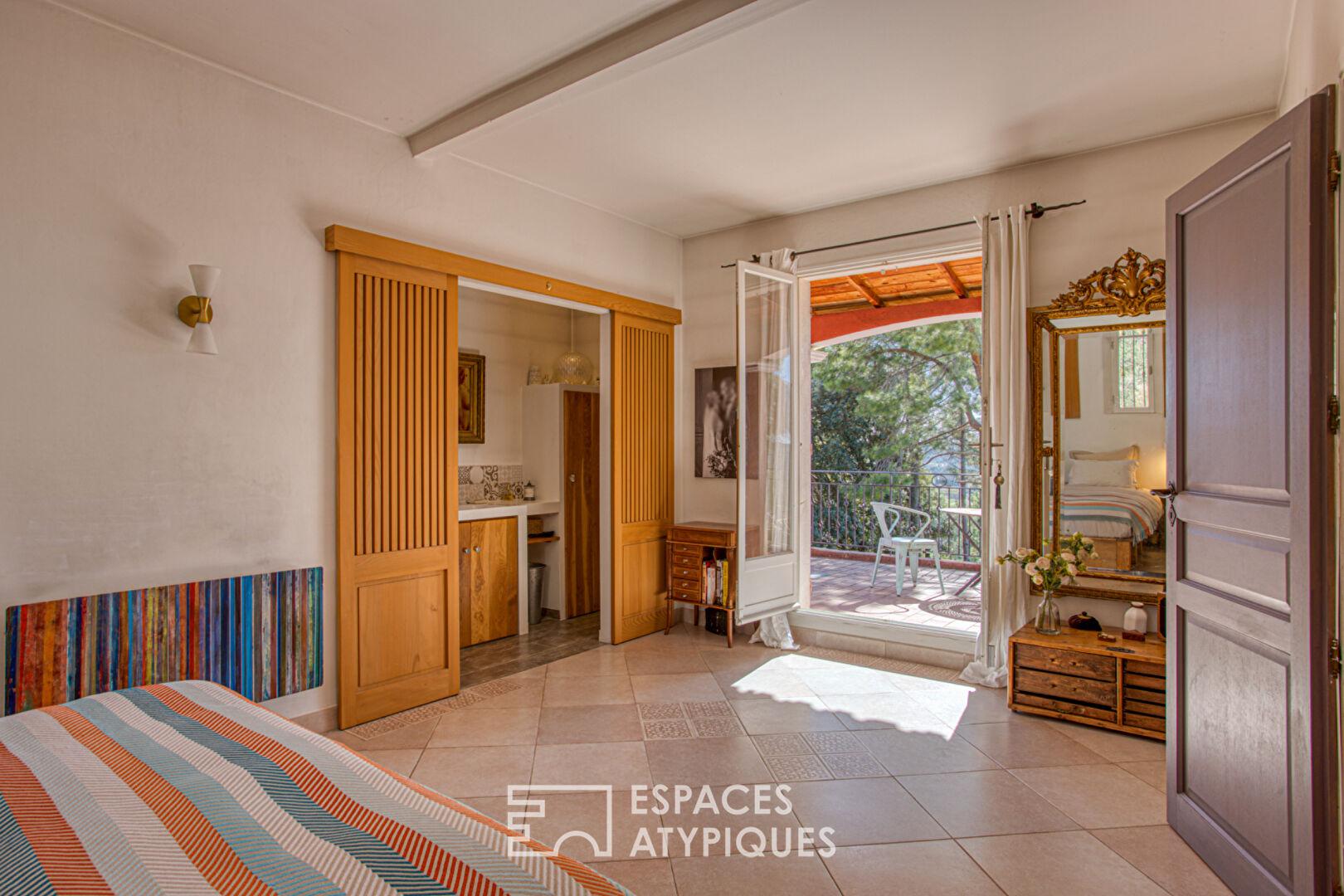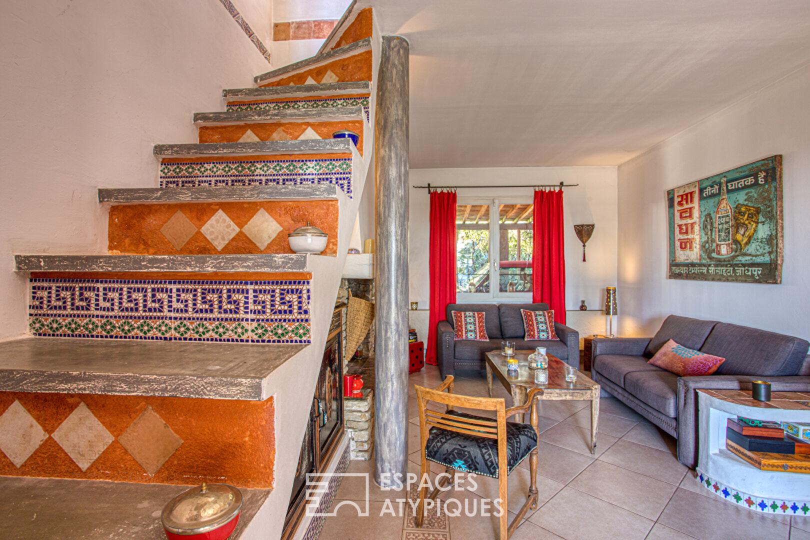 Le jardin, structuré entre pins, chênes et essences méditerranéennes, compose un décor naturel ponctué de rocailles et d’espaces de vie extérieurs soigneusement aménagés. La piscine aux dimensions généreuses (11,5 x 7 m), bordée de murets en pierre sèche, devient le point central des journées d’été. À proximité, la cuisine d’été prolonge cette ambiance conviviale avec un bar extérieur, des touches de mosaïques artisanales et des éléments décoratifs colorés qui rappellent l’inspiration latino de la maison.