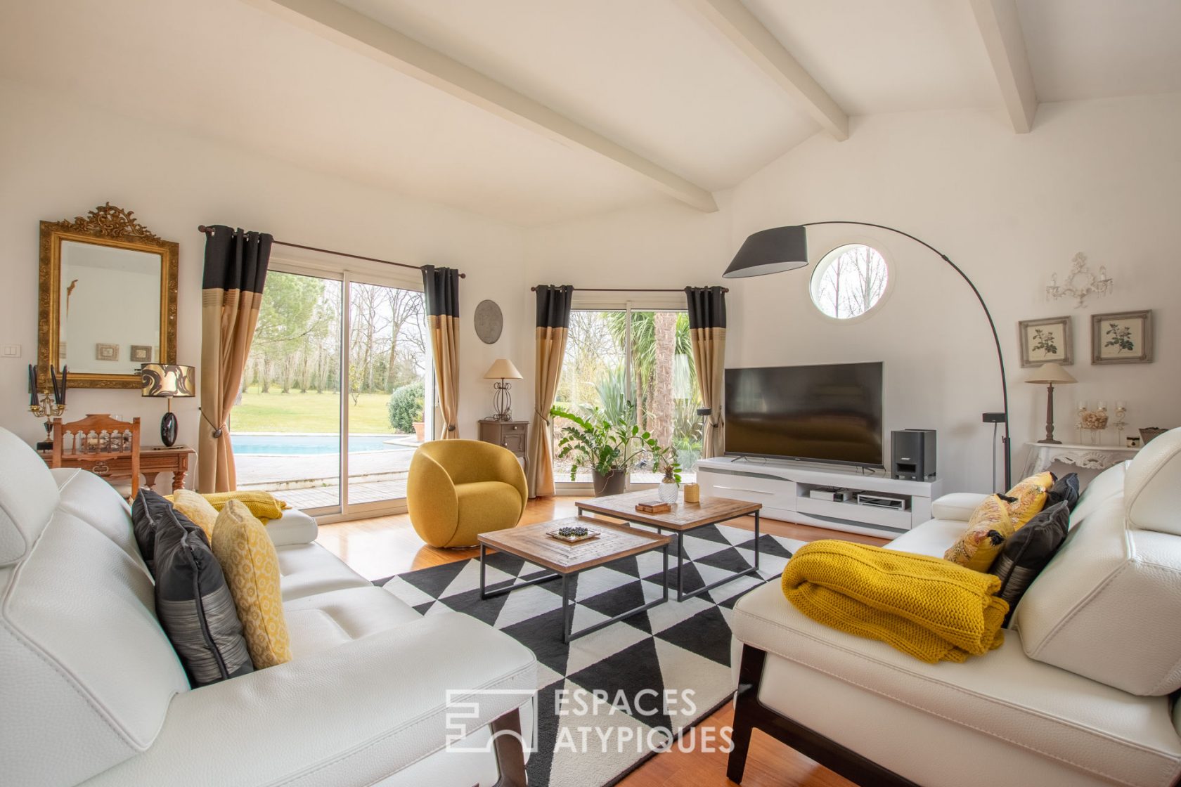 Discrètement implantée sur un vaste terrain, son architecture offre une triple exposition du soleil levant au couchant avec des pièces baignées de lumière dans un décor cosy chic et chaleureux ou le blanc immaculé des murs met en scène une décoration raffinée.