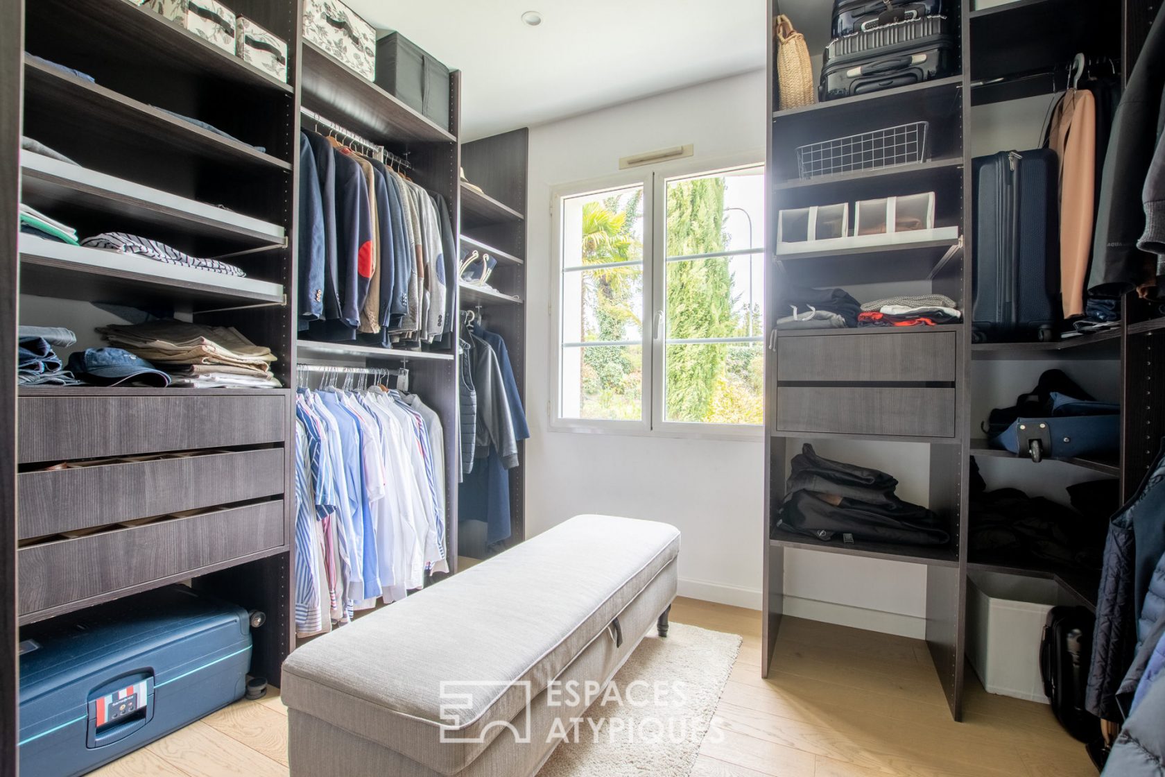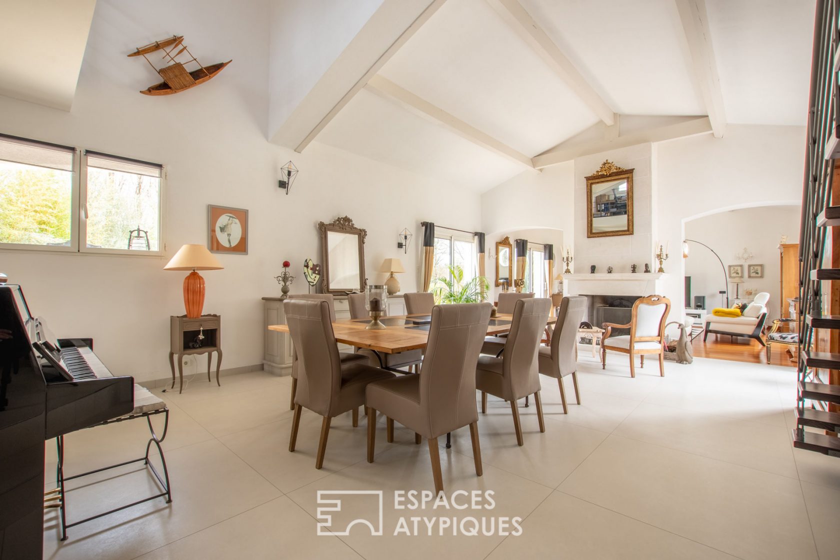 L’entrée s’ouvre d’une part sur l’espace vie et de l’autre l’espace nuit. L’espace vie se décline en un vaste séjour sous son toit cathédrale et sa cheminée élégante et sobre. Dans son prolongement un délicieux salon aux tonalités contemporaines tourné d’un côté vers la piscine et sa terrasse et de l’autre vers le verdoyant jardin. Une cuisine légèrement en surplomb domine le séjour, sa généreuse surface permet de prendre ses repas en famille ou entre amis dans un décor contemporain lumineux. En enfilade, une arrière cuisine accède directement au garage.