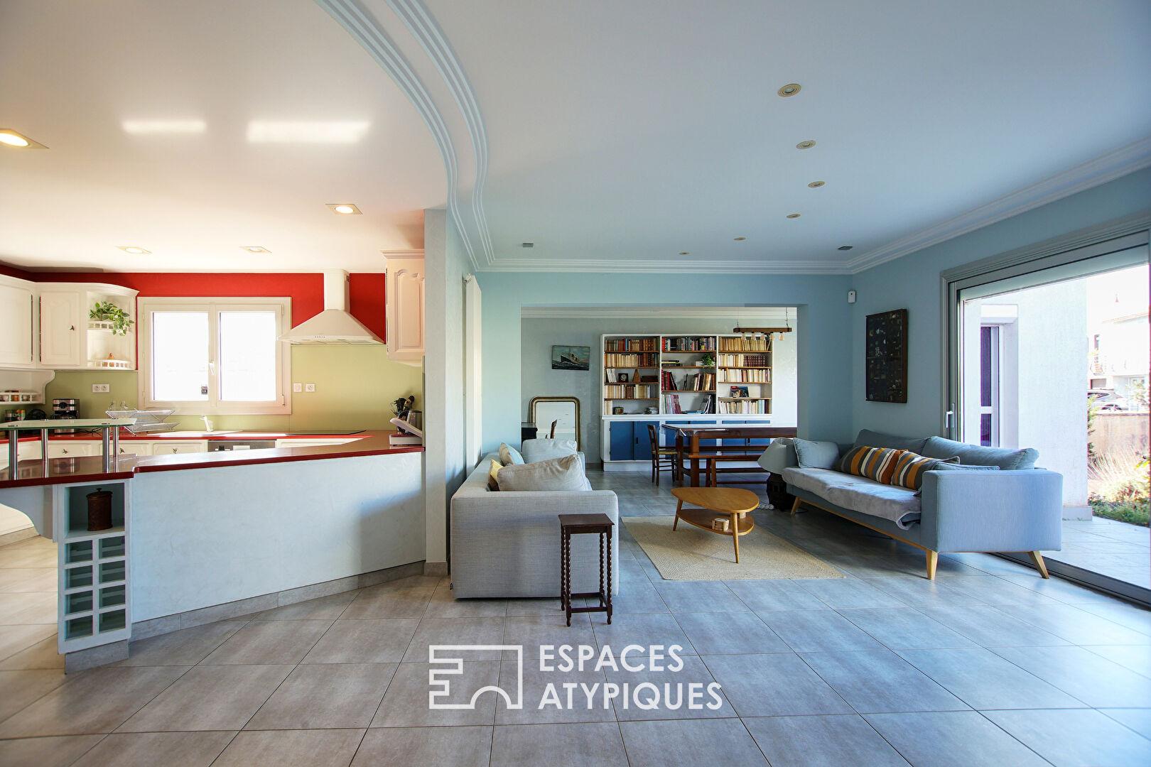 L’entrée ouvre sur une vaste pièce de vie baignée de lumière, organisée autour d’un salon et d’un espace salle à manger prolongés par de larges ouvertures sur l’extérieur. La cuisine indépendante, fonctionnelle, s’intègre harmonieusement à l’ensemble. L’espace nuit se compose de plusieurs chambres aux volumes confortables, accompagnées de salles d’eau. L’architecture de plain-pied offre une circulation fluide et un véritable confort de vie, tandis que certains éléments existants laissent entrevoir de belles perspectives de réaménagement et de modernisation.