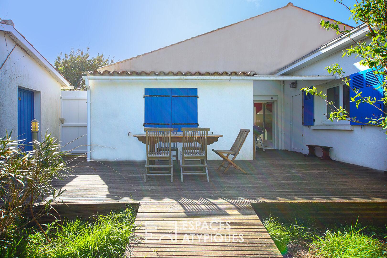 À l’extérieur, la terrasse en bois prolonge naturellement les espaces de vie et s’ouvre sur un jardin paysagé, propice à la détente. L’environnement, calme et résidentiel, permet un accès rapide au centre-ville, aux écoles, aux commerces et aux plages.