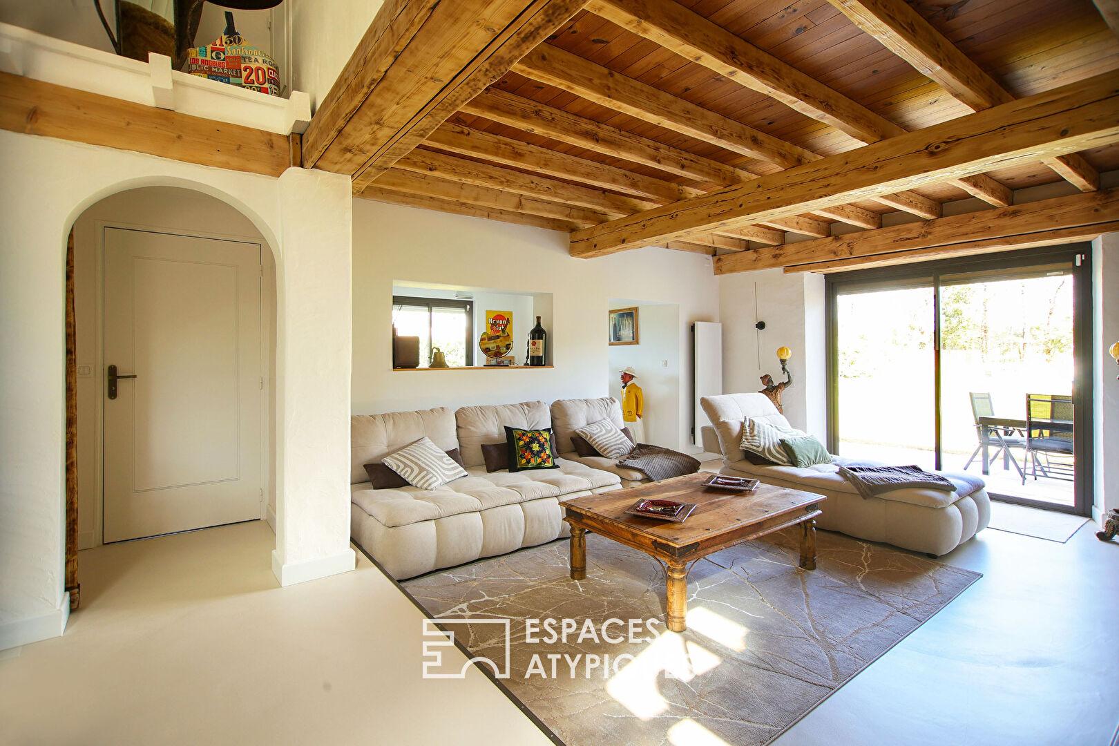 L’intérieur s’organise autour d’une pièce de vie lumineuse aux volumes ouverts, sublimée par une belle hauteur sous plafond, des poutres apparentes et une cheminée centrale. L’espace salon et salle à manger s’inscrit dans une ambiance chaleureuse, prolongée par de larges ouvertures sur le jardin. Une cuisine aménagée et équipée complète cet ensemble. L’espace nuit propose plusieurs chambres, dont certaines avec accès direct à l’extérieur, ainsi que des salles d’eau fonctionnelles. Un espace détente baigné de lumière, avec vue sur la nature, vient enrichir les prestations.