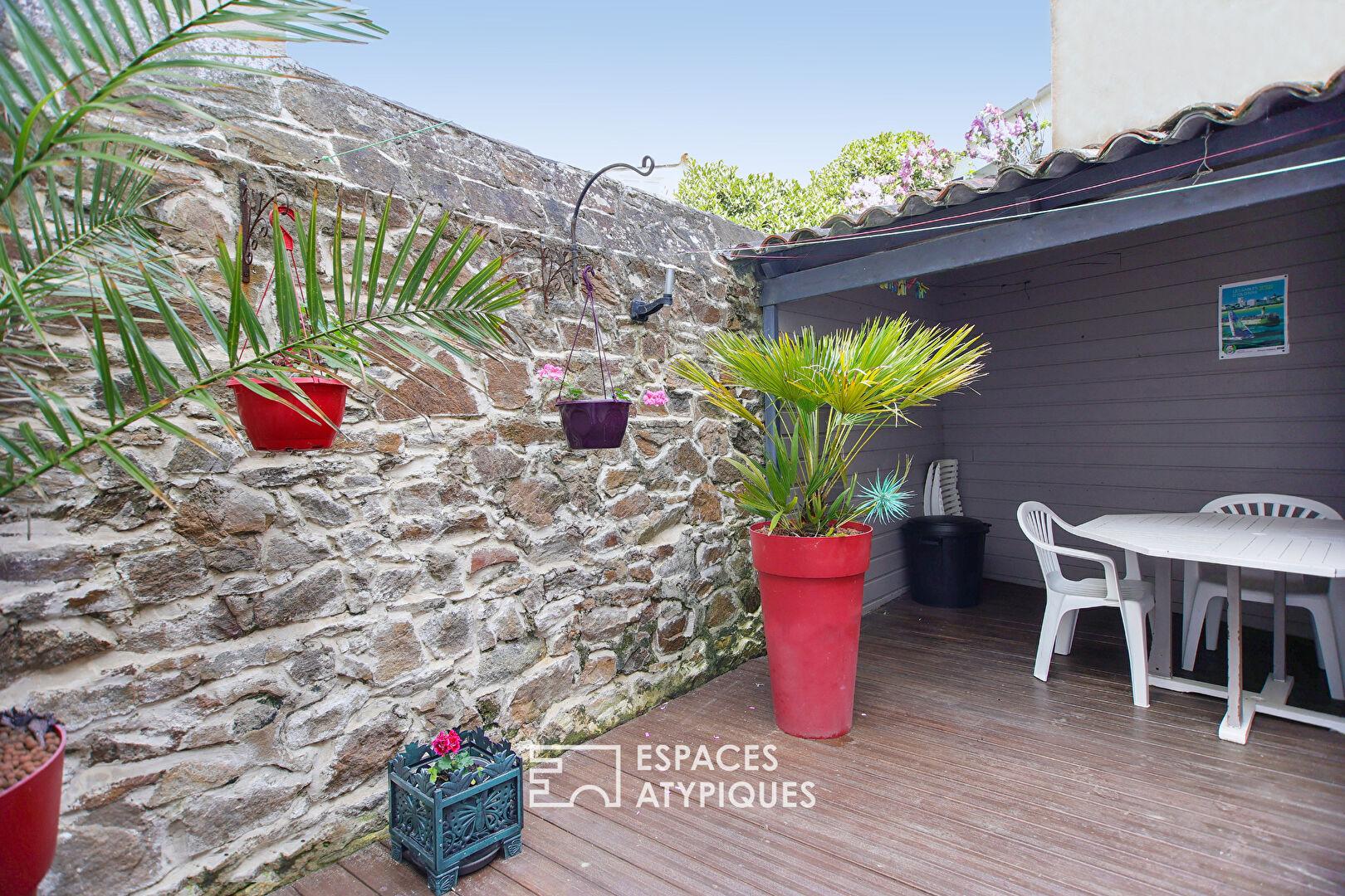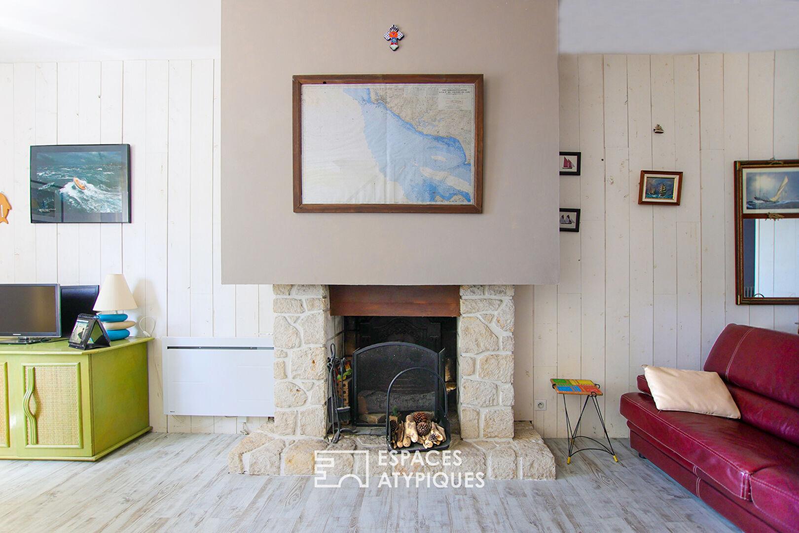 Dès l’entrée, l’architecture d’époque révèle un salon-séjour baigné de lumière, exposé plein sud, où une cheminée en pierre apporte une chaleur authentique. Une cuisine aménagée et équipée complète ce niveau. À l’étage, l’espace nuit se compose de deux chambres élégantes, dont l’une s’ouvre sur un balcon surplombant l’océan. Une salle de bains et une vaste troisième chambre sous les combles parachèvent cet intérieur à l’atmosphère sereine et singulière.