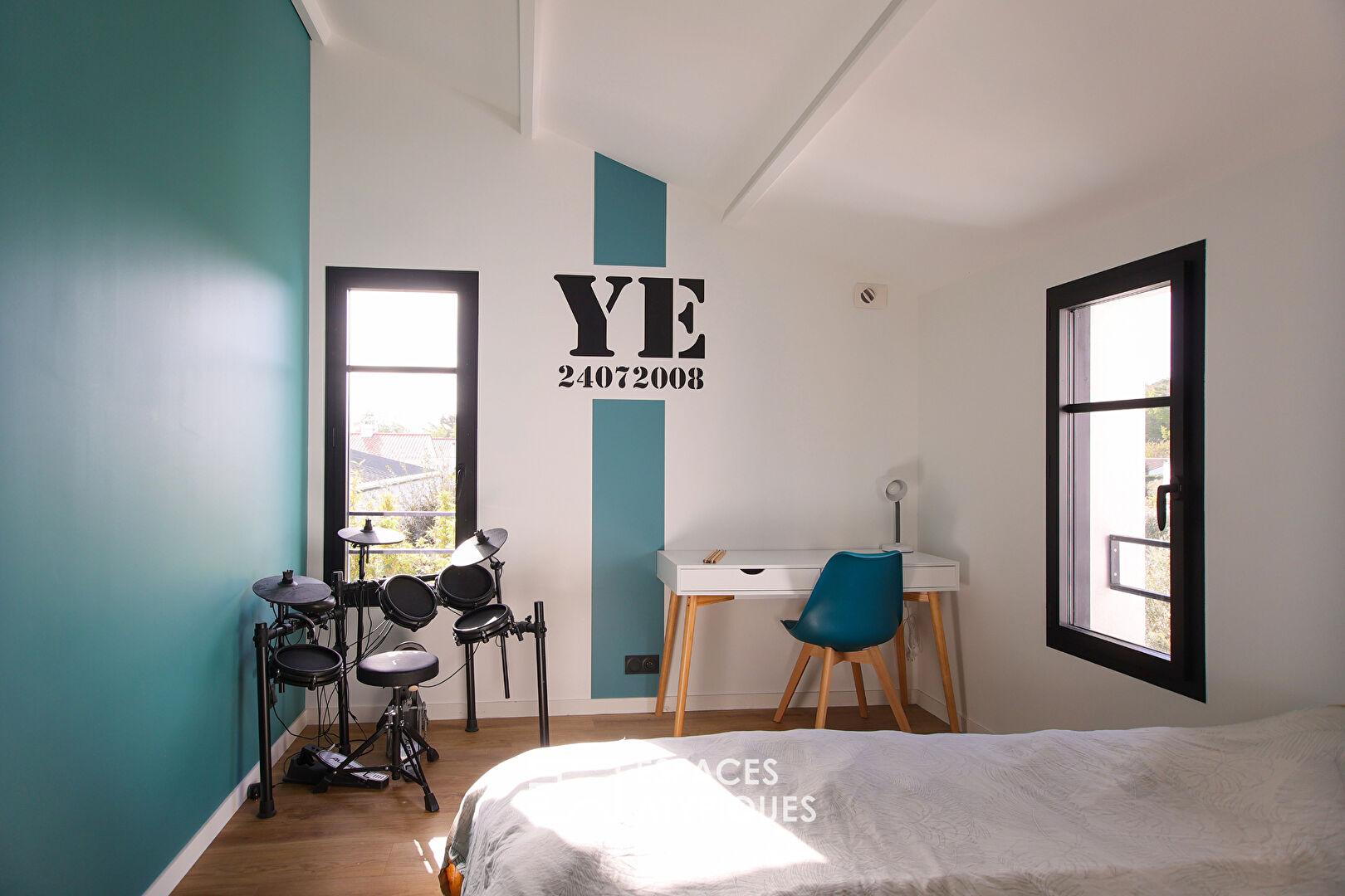 Située à Saint-Jean-de-Monts, en seconde ligne d’une impasse, cette maison contemporaine de 218 m² s’inscrit sur une parcelle de 1 100 m², offrant un cadre de vie intime et préservé.