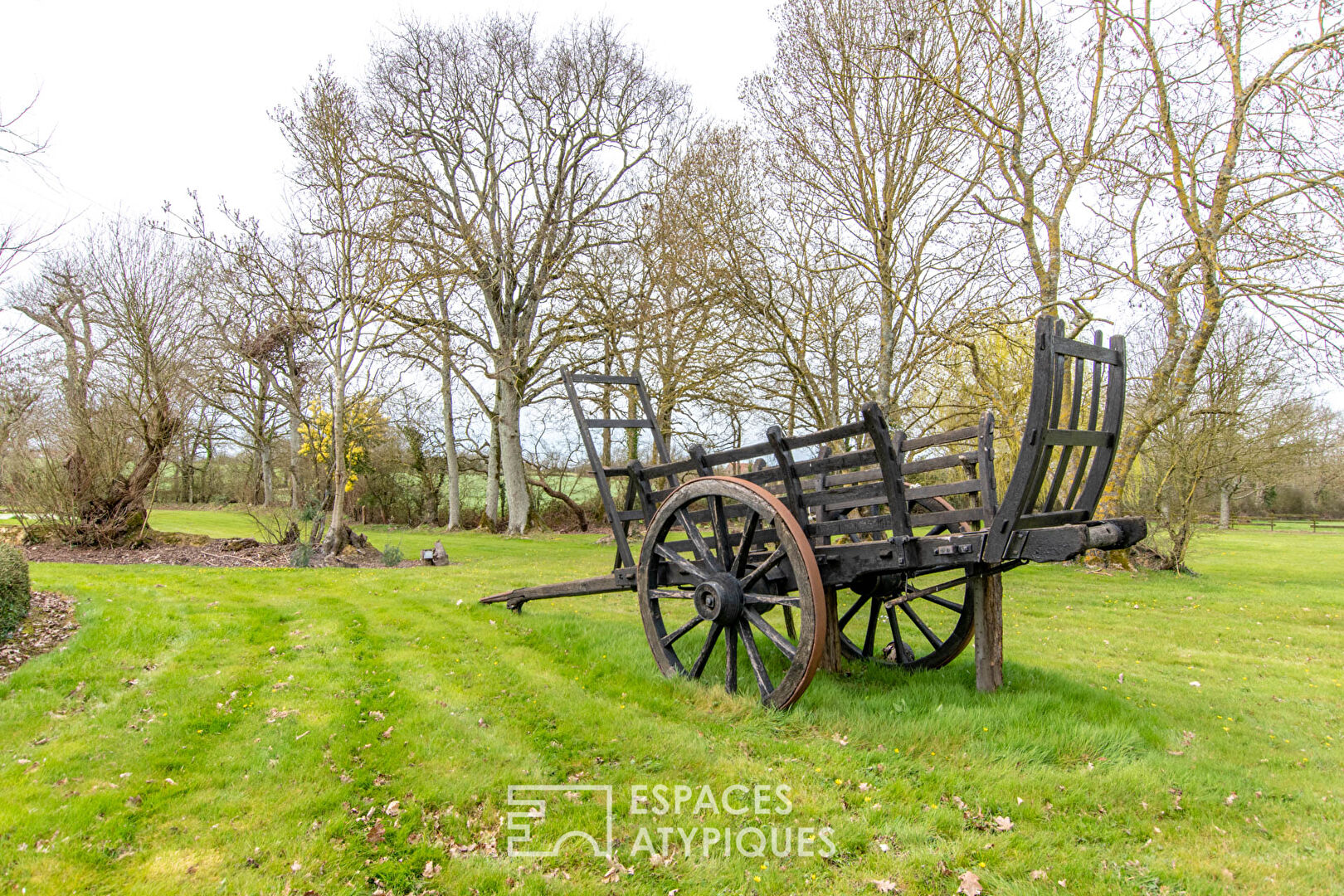 Cette maison aux tonalités blanches et bleues est complétée par une grange à la hauteur sous plafond impressionnante et à quelques dépendances. Au coeur d’un jardin de plus de 3 hectares, doté d’une jolie mare, et bénéficie d’un pré de plus de 2 hectares qui ravira les amateurs de chevaux.