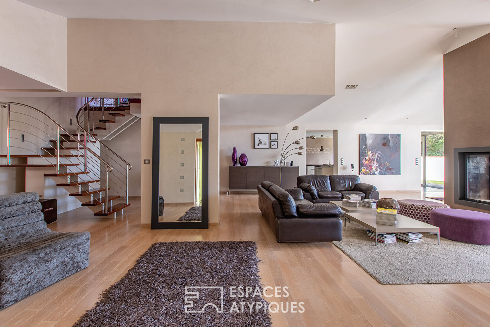 L’entrée s’ouvre sur une magistrale et très lumineuse pièce de vie de plus de 120 m², répondent aux codes architecturaux contemporains. La décoration, sobre et élégante, est marquée par des tonalités claires, qui contribuent à créer une ambiance apaisante. Le séjour est agrémenté d’une cheminée double face, en complément du chauffage central par le sol. La pièce de vie se poursuit par la cuisine américaine, dotée de deux îlots, alliant fonctionnalité et convivialité. Une large porte coulissante dissimule l’accès à la buanderie et un accès pratique au double garage. Dans le salon, unique en son genre, les amateurs et collectionneurs seront séduits par cette double porte qui abrite secrètement une cave à vin climatisée de 10 m². Derrière une surprenante porte japonaise coulissante, on découvre un espace bureau qui marque la transition entre l’espace de vie et la partie nuit composée de deux belles chambres se partageant une vaste salle de bain. Une belle pièce de 25 m² complète ce premier niveau, aujourd’hui occupée en salle de jeux qui peut être transformée en chambre parentale demain.