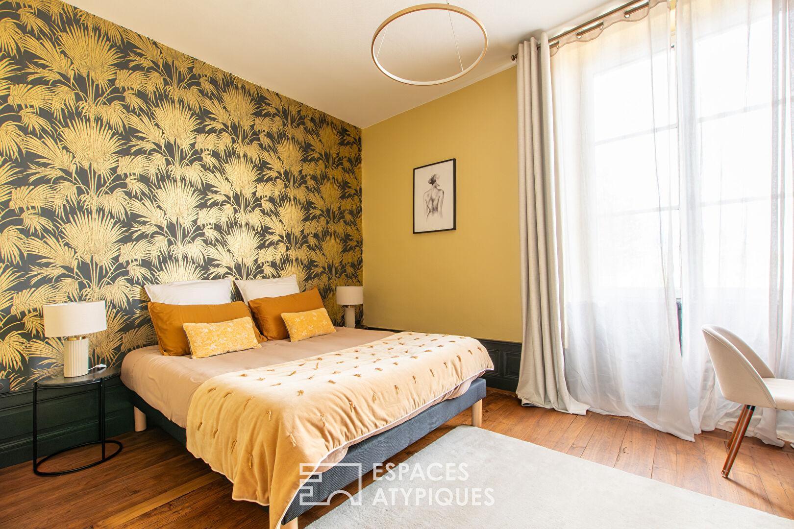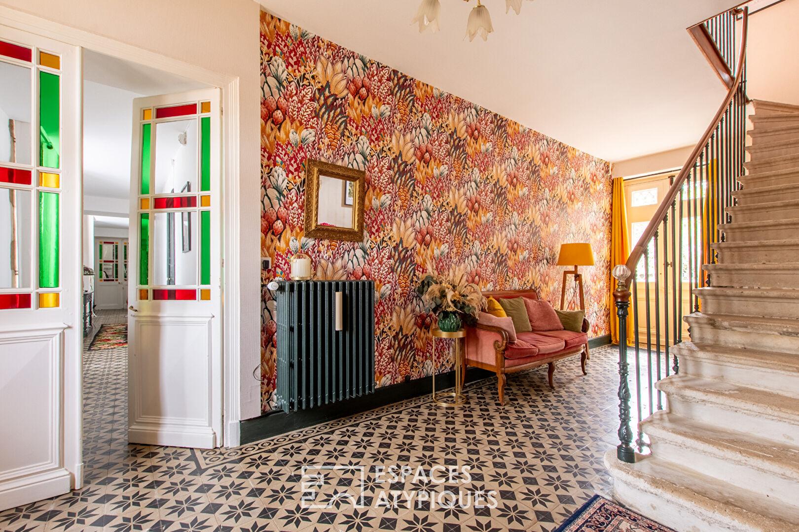 L’entrée dans les lieux se fait par le vaste hall paré de carreaux de ciment d’origine qui contraste élégamment avec la tapisserie colorée très actuelle.