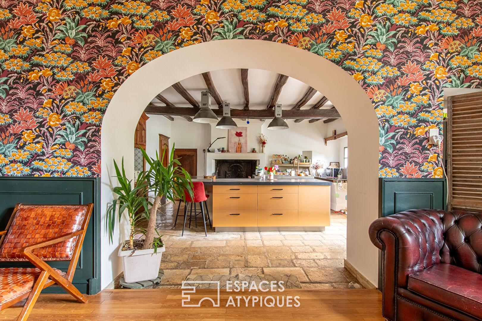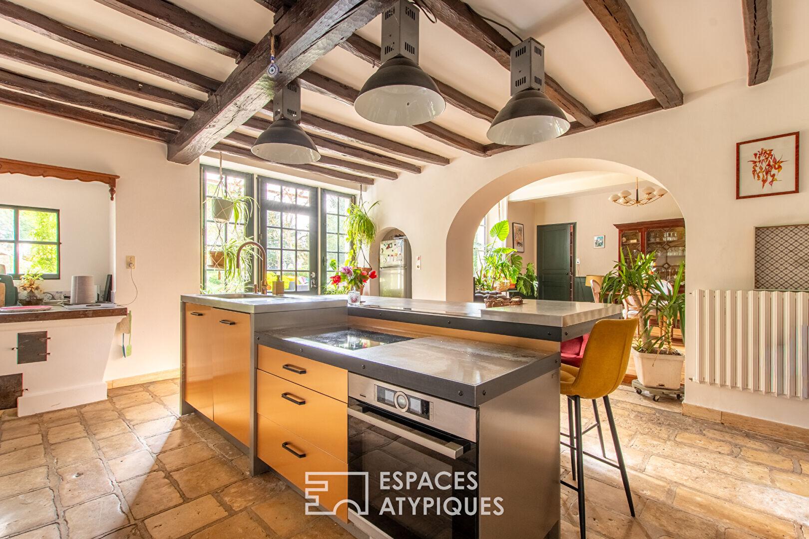 Cette pièce de vie communique avec une belle orangerie aménagée en salle-à-manger dont le dallage en pierre provient de la célèbre Abbaye du village. De l’autre côté, un salon plus intimiste aux teintes pourpres offre un passage direct vers le jardin et la piscine. Une belle arche relie la salle-à-manger principale à une cuisine confortable et pleine de charme, où les éléments d’époque s’accordent harmonieusement avec le grand îlot central, propice à des moments conviviaux. Une arrière-cuisine et une lingerie complètent le rez-de-chaussée. Le bel escalier en pierre dessert une première partie nuit offrant deux grandes chambres avec cheminée et une salle de bain au style seventies ravissant.