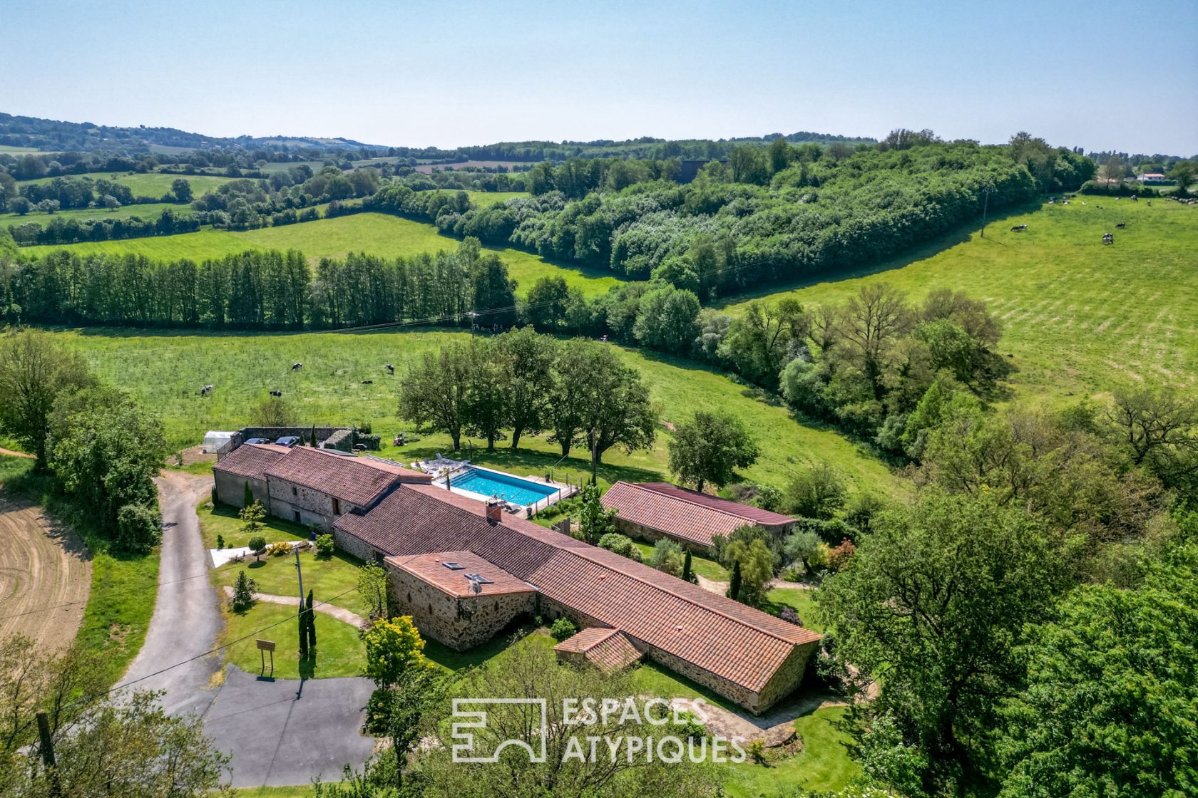 À la lisière des Herbiers, cette authentique maison de campagne s’étend sur plus de 355 m2, au coeur d’un cadre verdoyant d’environ 4000 m2.