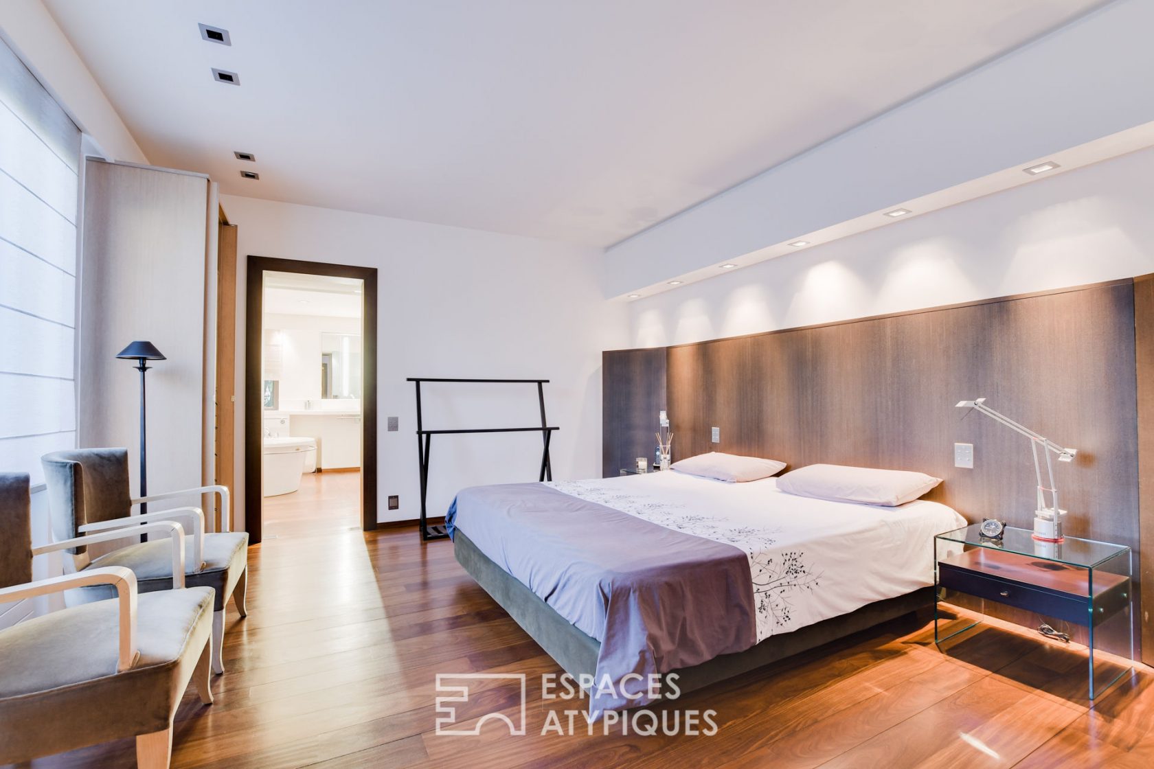 Les espaces de vie se déploient ainsi généreusement sur plus de 100m2, et sont très séparés des espaces détentes et des parties nuit. Lingerie et salle de jeux mènent à la suite parentale et sa salle de bains privative, à la vue panoramique sur la verdure environnante. Se trouvent ensuite la grande chambre d’amis, la salle de sports, 2 autres confortables chambres, avec salles d’eau privatives, un abri de voitures et un jardin d’hiver.
